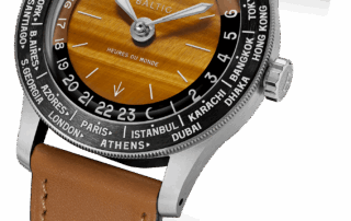 Baltic no hace una copia literal de Cottier, sino una reinterpretación. En lugar del clásico disco de ciudades, aquí el bisel de cerámica lleva las zonas horarias, mientras un disco transparente de 24 horas sobre la esfera completa la lectura. Por cada hora que avanza el minutero, el disco da media vuelta. Simple, funcional y muy elegante.