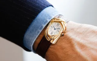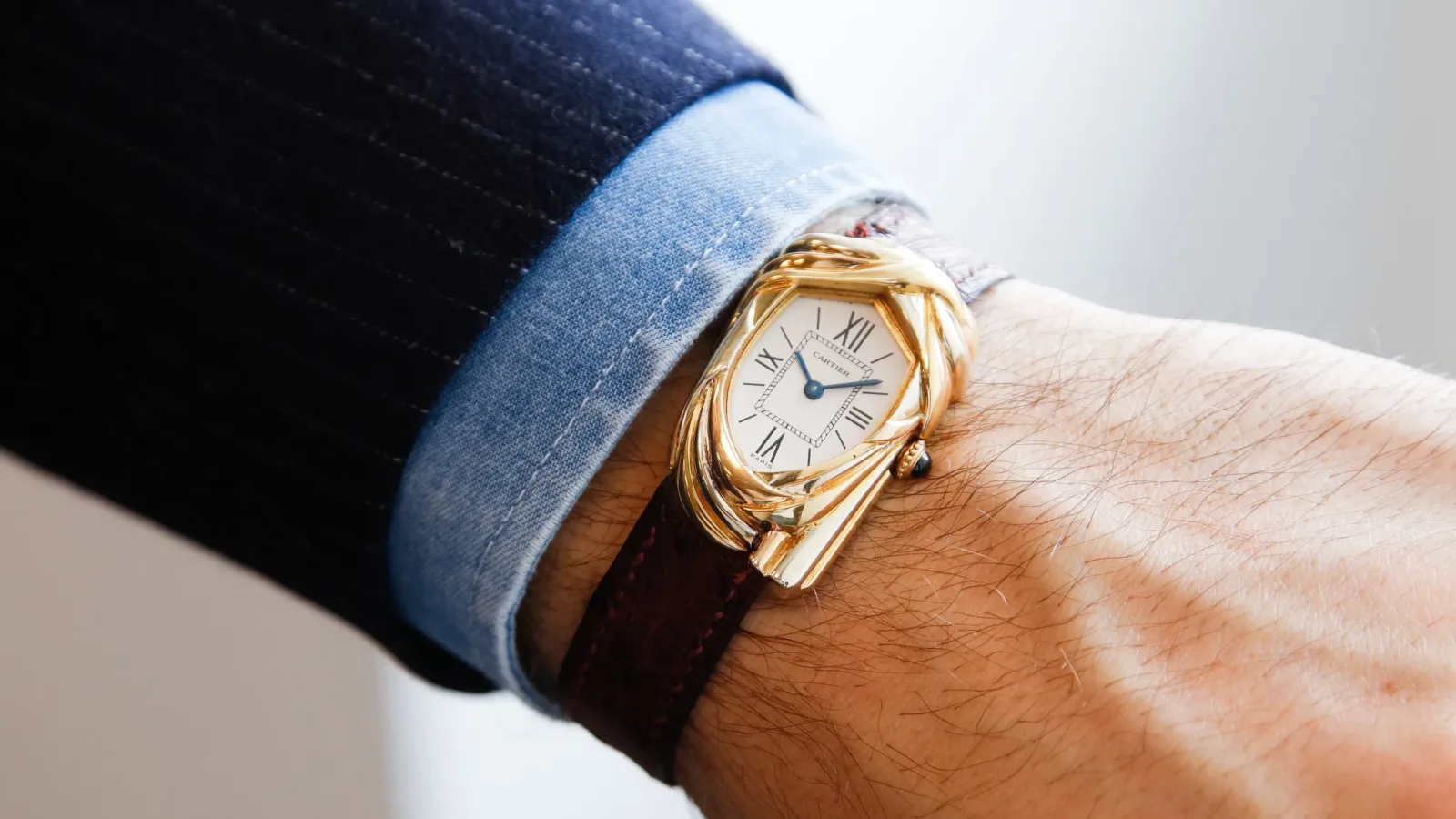 Sin duda, el rasgo más llamativo son los pliegues escultóricos que replican el cheich y envuelven la caja, generando un juego de luces y sombras único, además de aportar una gran sensación de volumen y profundidad. A ello se suma el característico cabujón de Cartier: una corona rematada con un zafiro azul, que añade un toque sofisticado y, permitidme la licencia, casi antropomórfico, como si asomara una oreja.
