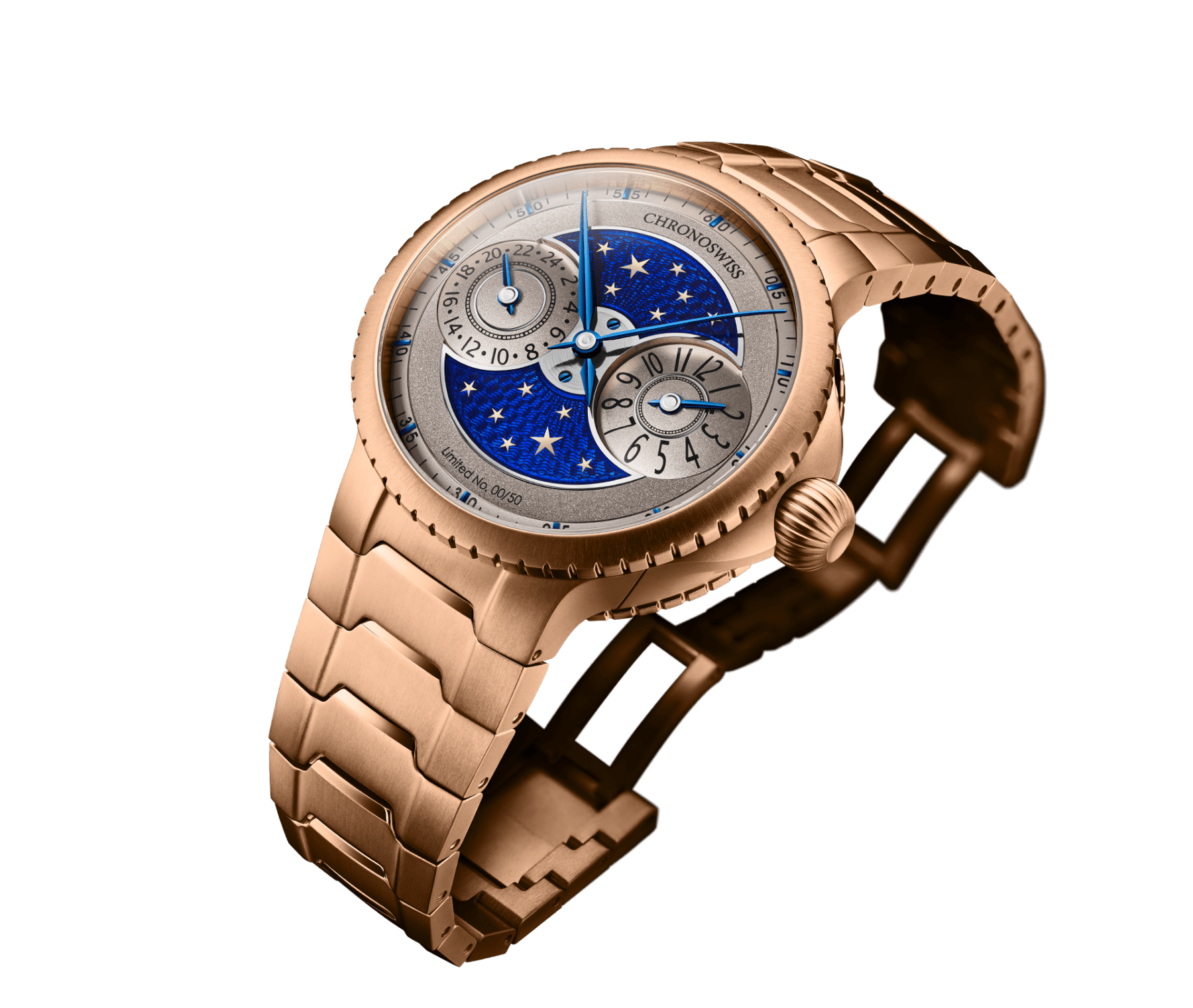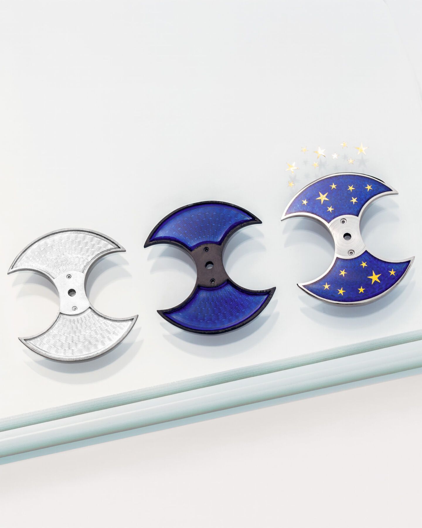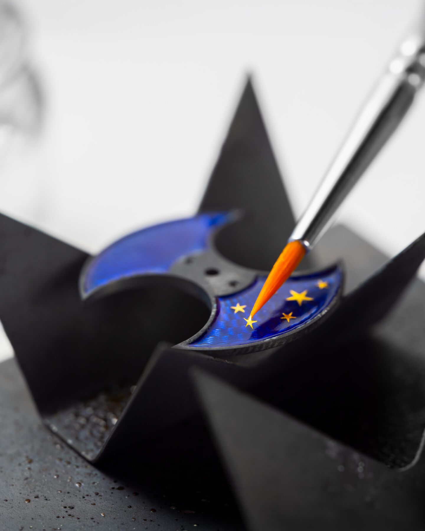 Chronoswiss utiliza la técnica paillonné (no confundir con el cloisonné), que consiste en colocar finísimas láminas de oro —los paillons—, en este caso en forma de estrellas cortadas a mano, una a una sobre el esmalte.