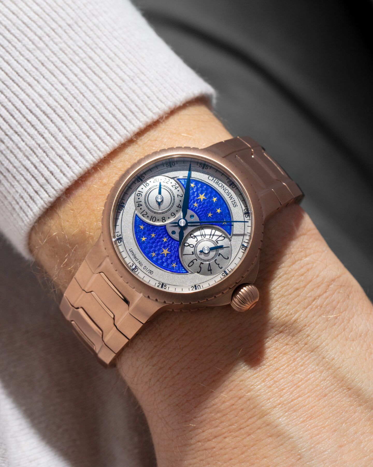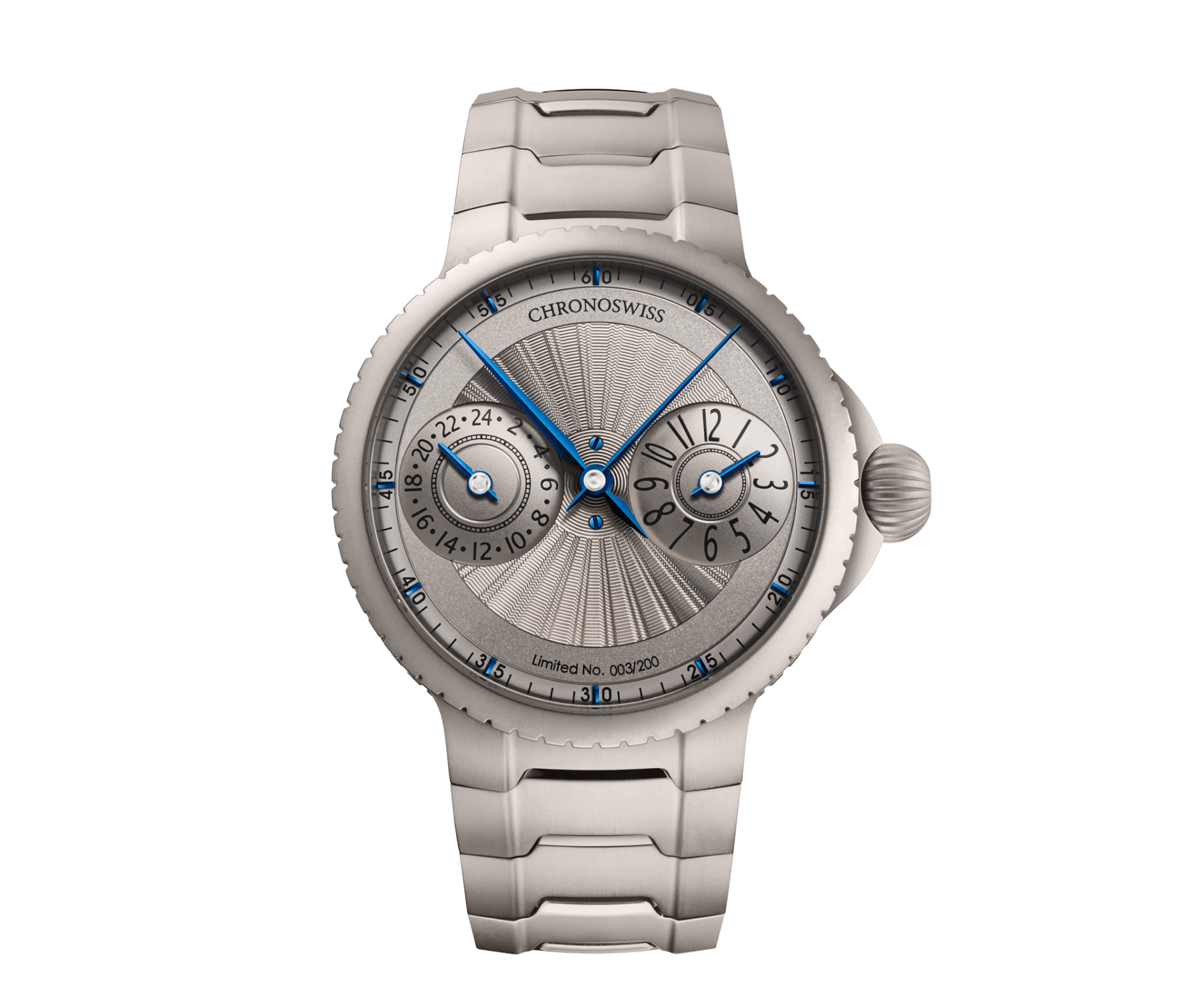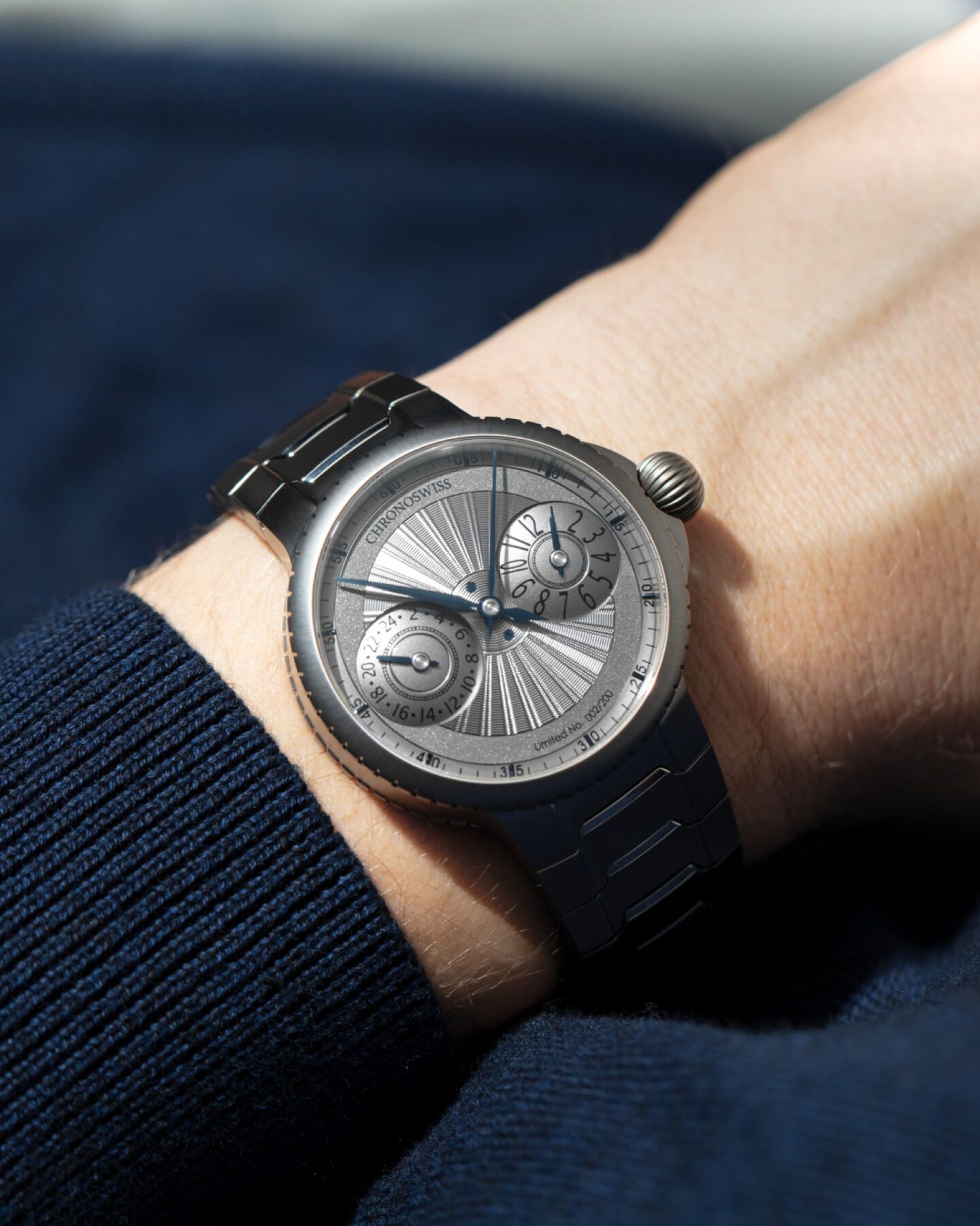 Chronoswiss ha optado por una caja y brazalete en titanio grado 5, lo que convierte al reloj en una pieza ligera y cómoda para moverse por el mundo.