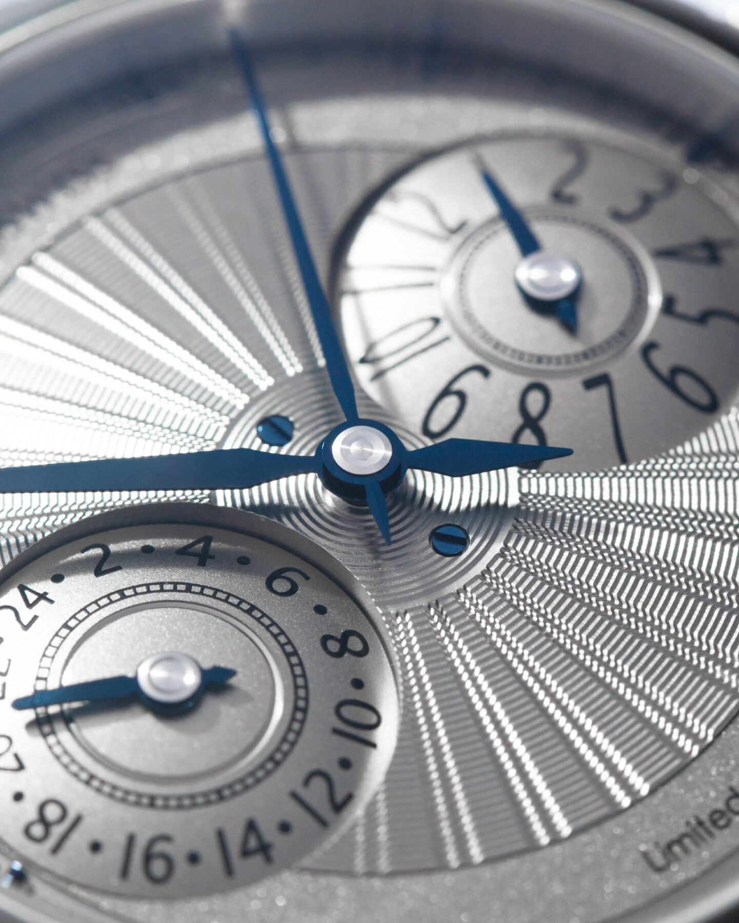 El color gris del titanio hace que las agujas, los índices y los tornillos en azul destaquen sobre el conjunto.