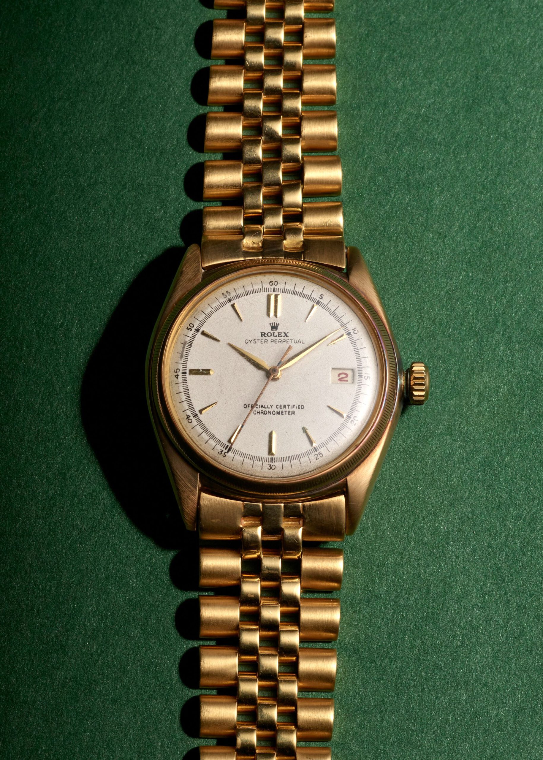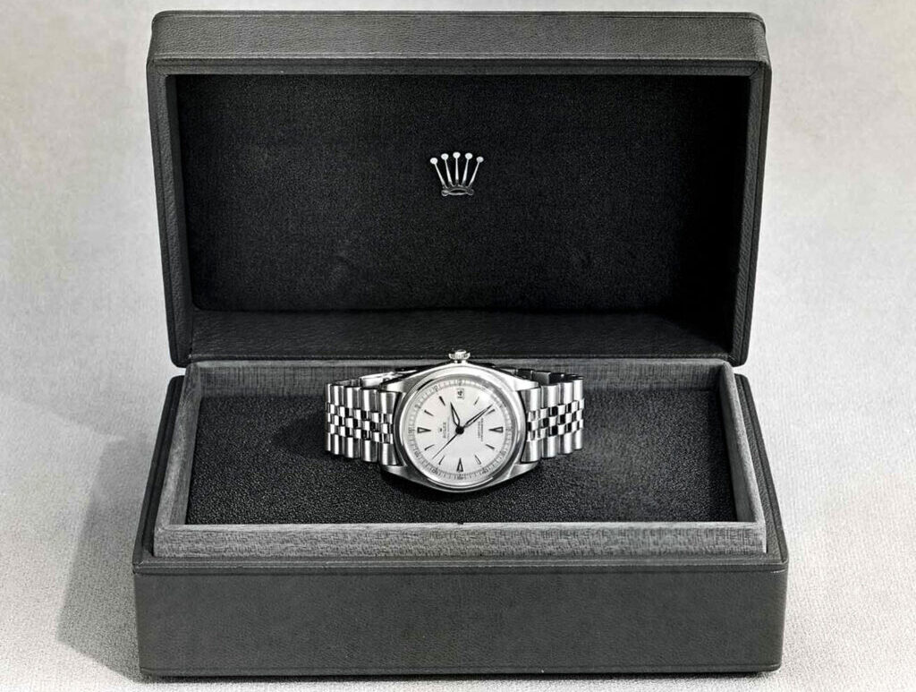 Por aquel entonces, la pieza carecía de algunas de las señas de identidad del modelo vigente. Sus índices y manecillas puntiagudas difieren de los bastones implementados en la actualidad. Ausencias como la del cyclops —pequeña lupa introducida en 1953 con la referencia 6305 para aumentar el tamaño de la ventana de fecha–, dificultan la lectura. Sin embargo, tiene todos los elementos necesarios que mantienen la esencia del Datejust. Caja oyster con corona roscada, brazalete jubilee, bisel estriado y fecha. De esa manera se genera una conexión entre pasado y presente que lo mantiene tan vivo como atemporal.