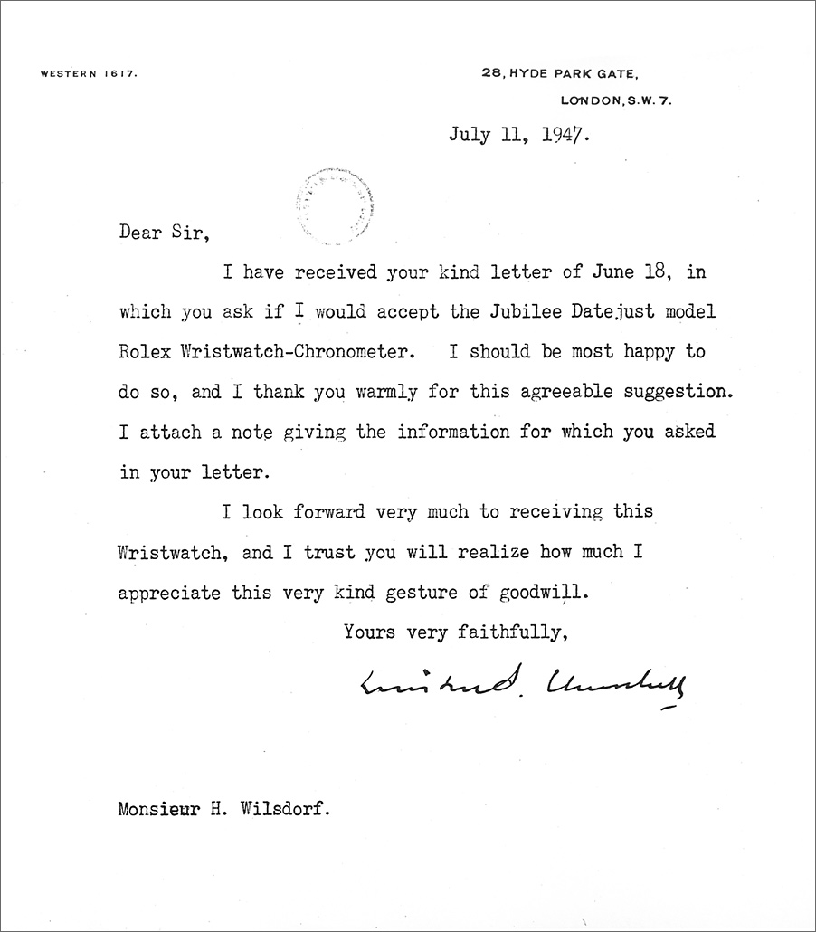 El 18 de junio de 1947, Churchill recibió una carta procedente de Suiza en la que Wilsdorf le ofrecía formalmente la pieza. En la carta, le invitaba a especificar los detalles que deseara para la pieza, a lo que el ex primer ministro respondió el 11 de julio de 1947 con instrucciones precisas: