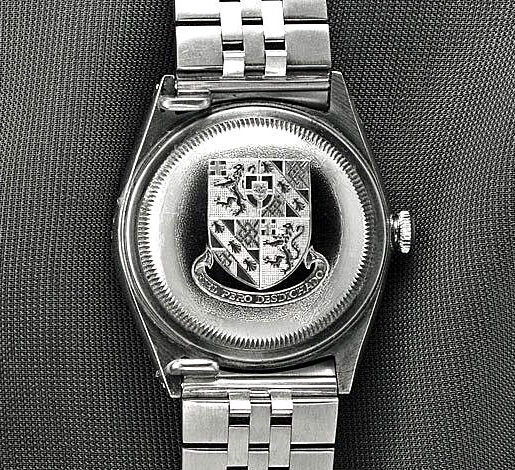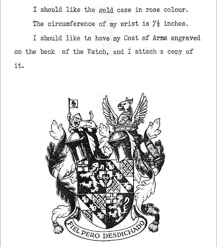 “Me gustaría que la caja de oro fuera de color rosa. La circunferencia de mi muñeca es de 7.5 pulgadas. Me gustaría que grabaran mi escudo de armas en el reverso del reloj, y adjunto una copia del mismo”.