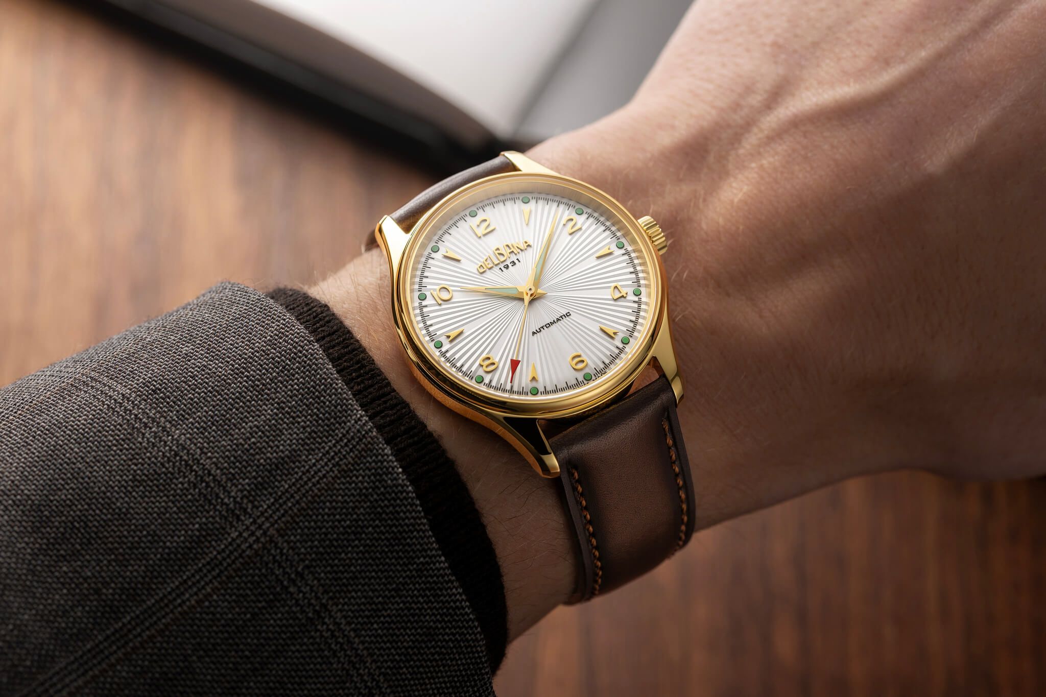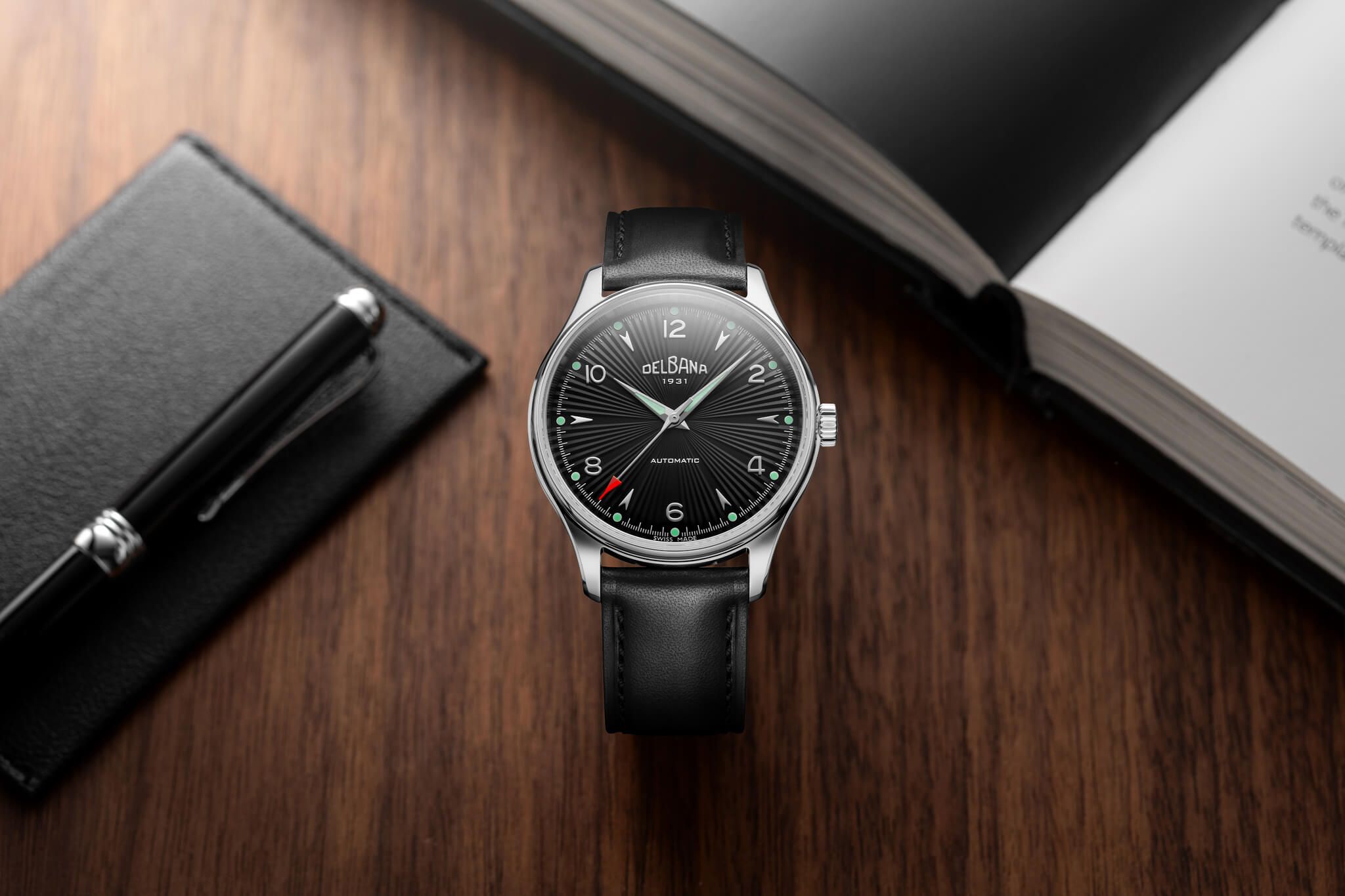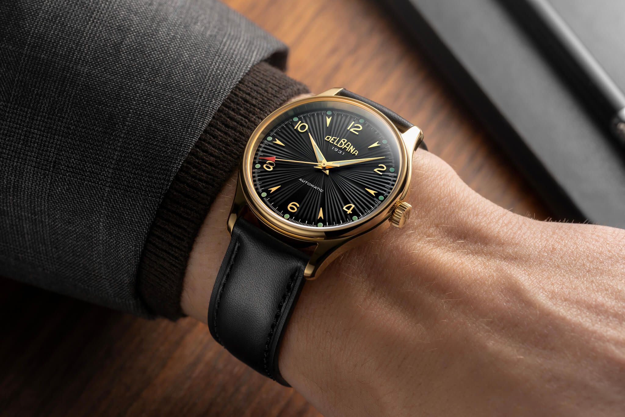 Para esta nueva esfera, los diseñadores de Delbana han optado por un patrón guilloché radial, que aporta una gran sensación de profundidad y un atractivo juego de reflejos. Además, han incorporado índices aplicados en forma de flecha y números arábigos, un detalle que personalmente me encanta.
