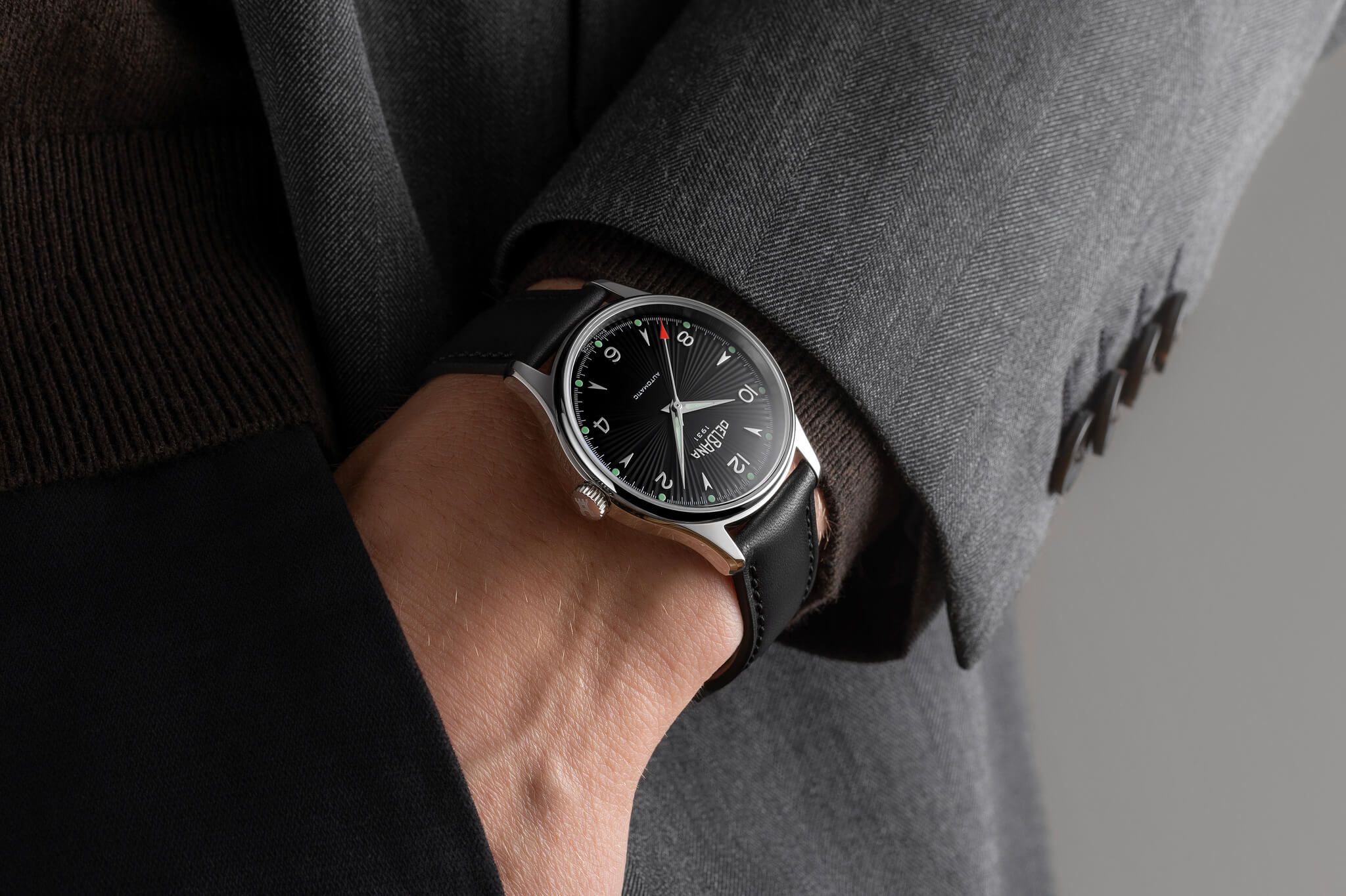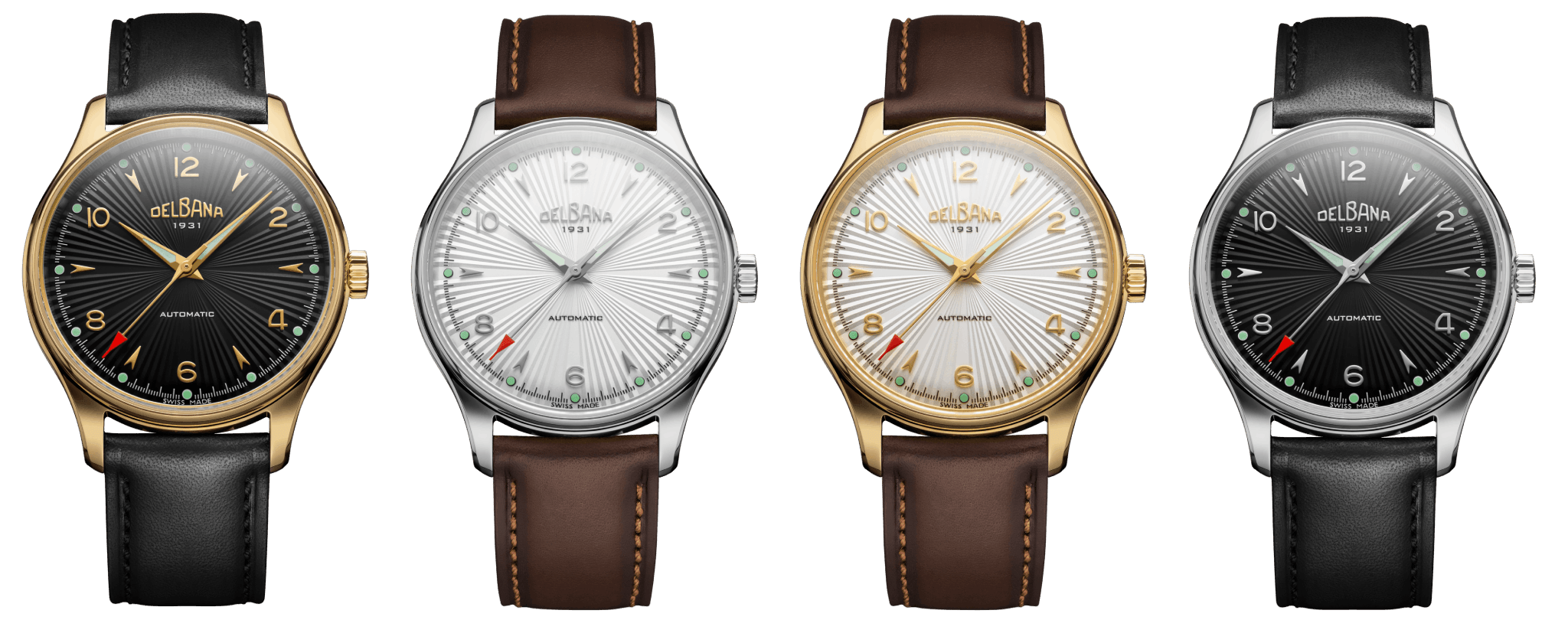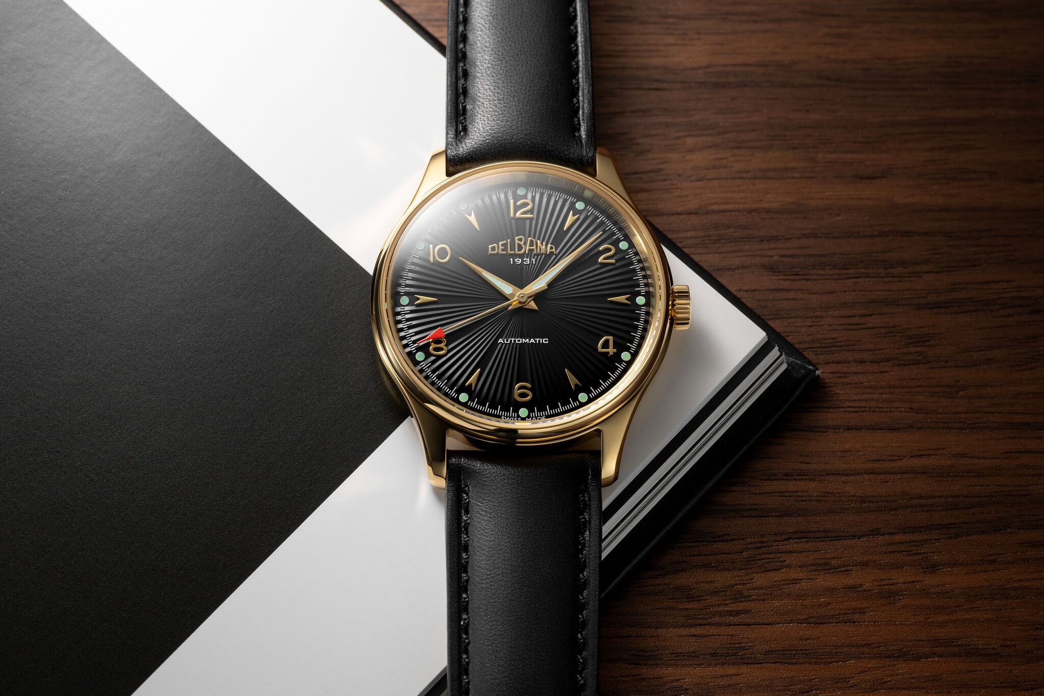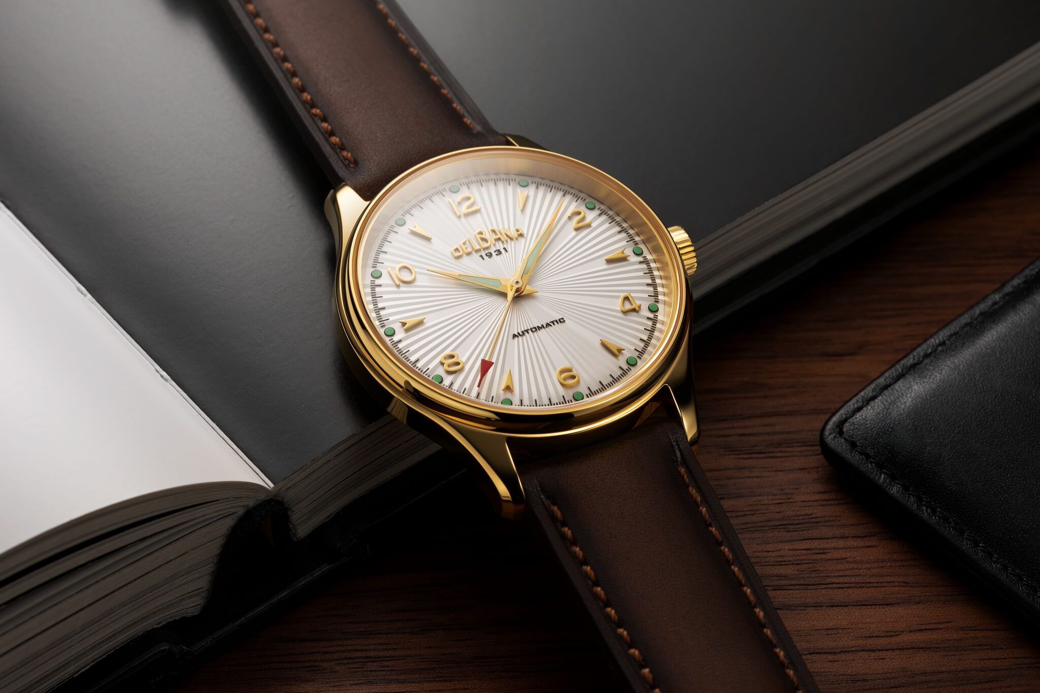 Para esta nueva esfera, los diseñadores de Delbana han optado por un patrón guilloché radial, que aporta una gran sensación de profundidad y un atractivo juego de reflejos. Además, han incorporado índices aplicados en forma de flecha y números arábigos, un detalle que personalmente me encanta.