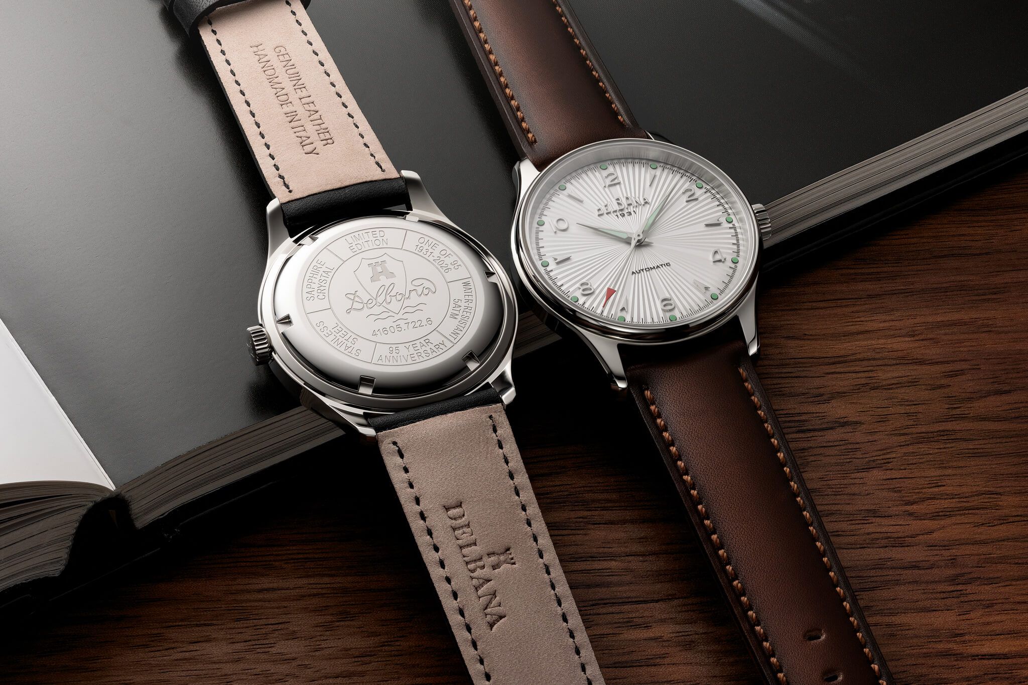 El fondo de la caja está grabado en el centro con una torre histórica dentro de un escudo procedente de los archivos de Delbana, en honor a la fundación de la marca en 1931. Alrededor de la torre también aparecen grabados la resistencia al agua de 5 atmósferas, las palabras “Limited Edition”, la indicación de cristal de zafiro y el número de la edición limitada, marcado como “One of 95”.