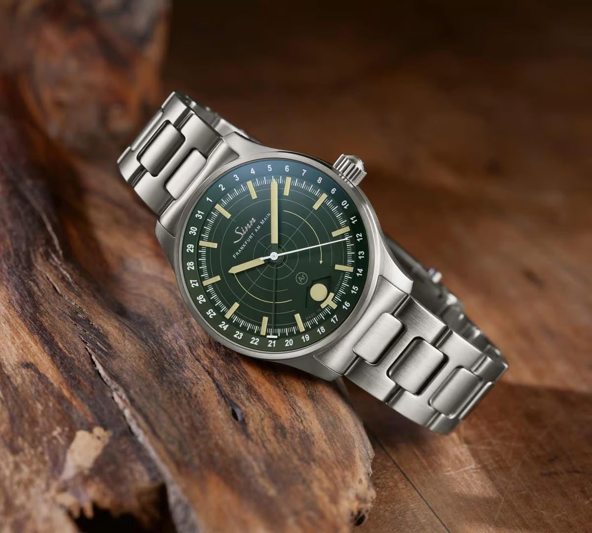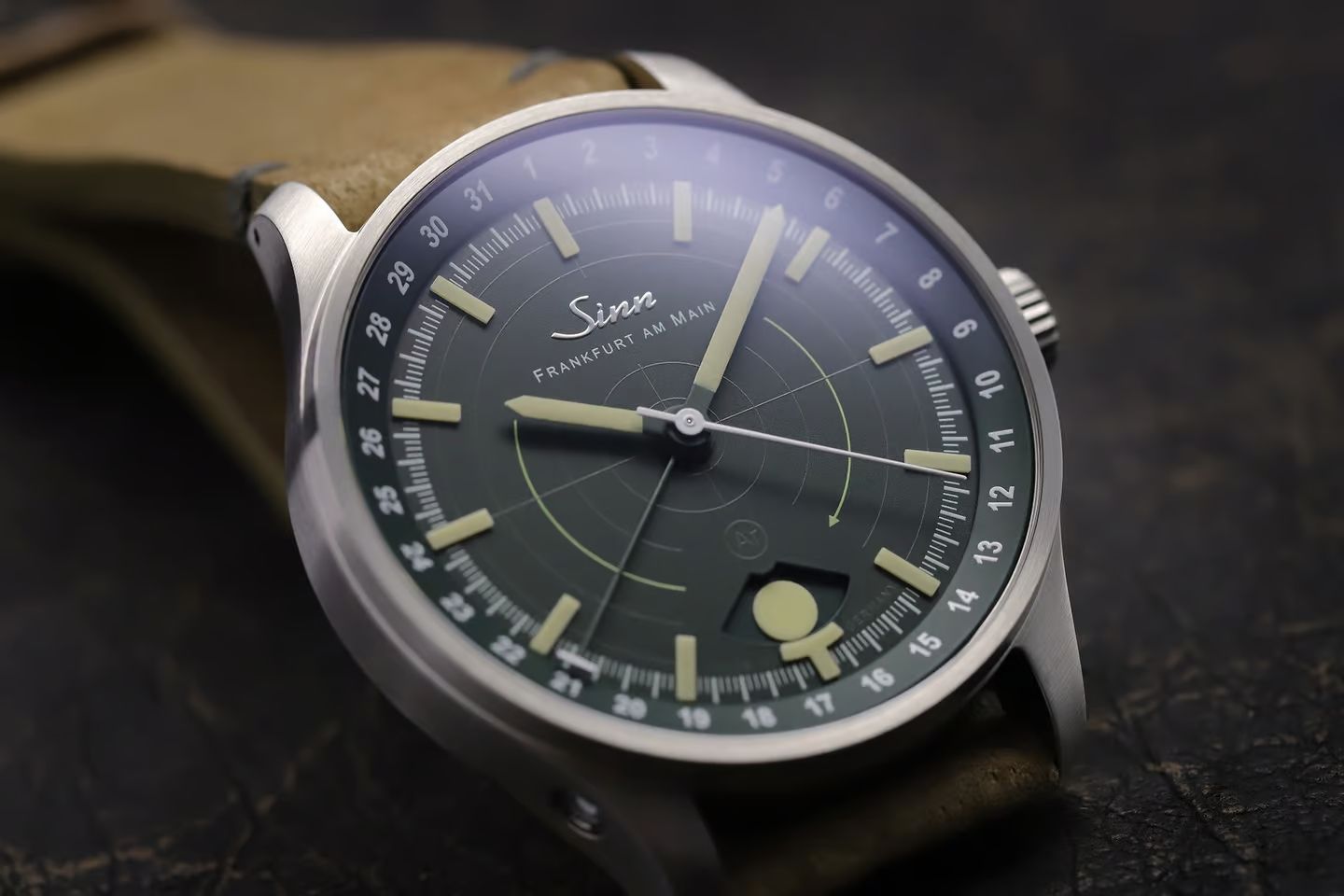 El dial, además del Sauensonne a las 6, presenta un color verde oscuro muy acorde con la temática, un patrón concéntrico, como el de un radar o la mira de una escopeta (detalle: aparece una flecha indicando la dirección de giro de la luna en el Sauensonne), y en el exterior, un bisel interno fijo con función de fecha, indicada mediante aguja central estilo pointer date.