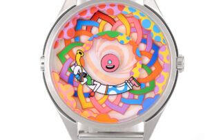 La esfera es un pequeño espectáculo en constante movimiento: un patrón simétrico entrelazado forma un círculo lleno de colores en el centro, acompañado por Muru, el icónico personaje de Murugiah, el diseñador del reloj. A su alrededor, unas nubes coloridas se suman a la escena, creando un conjunto alegre y dinámico que no deja de moverse, brutalmente divertido. ¿Y como leo la hora te preguntarás? Pues muy sencillo, el pétalo rojo indica las horas y Muru está señalando con el dedo los minutos, ¡creatividad al máximo!