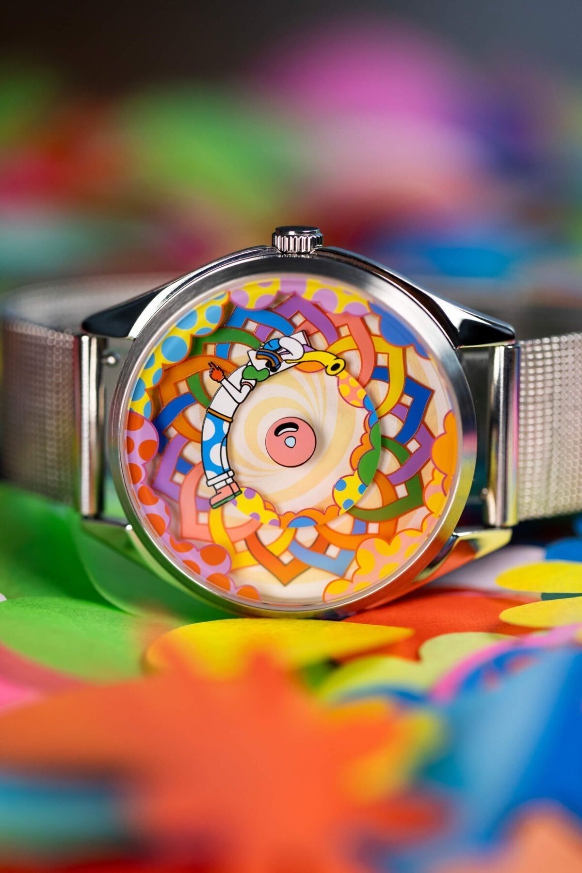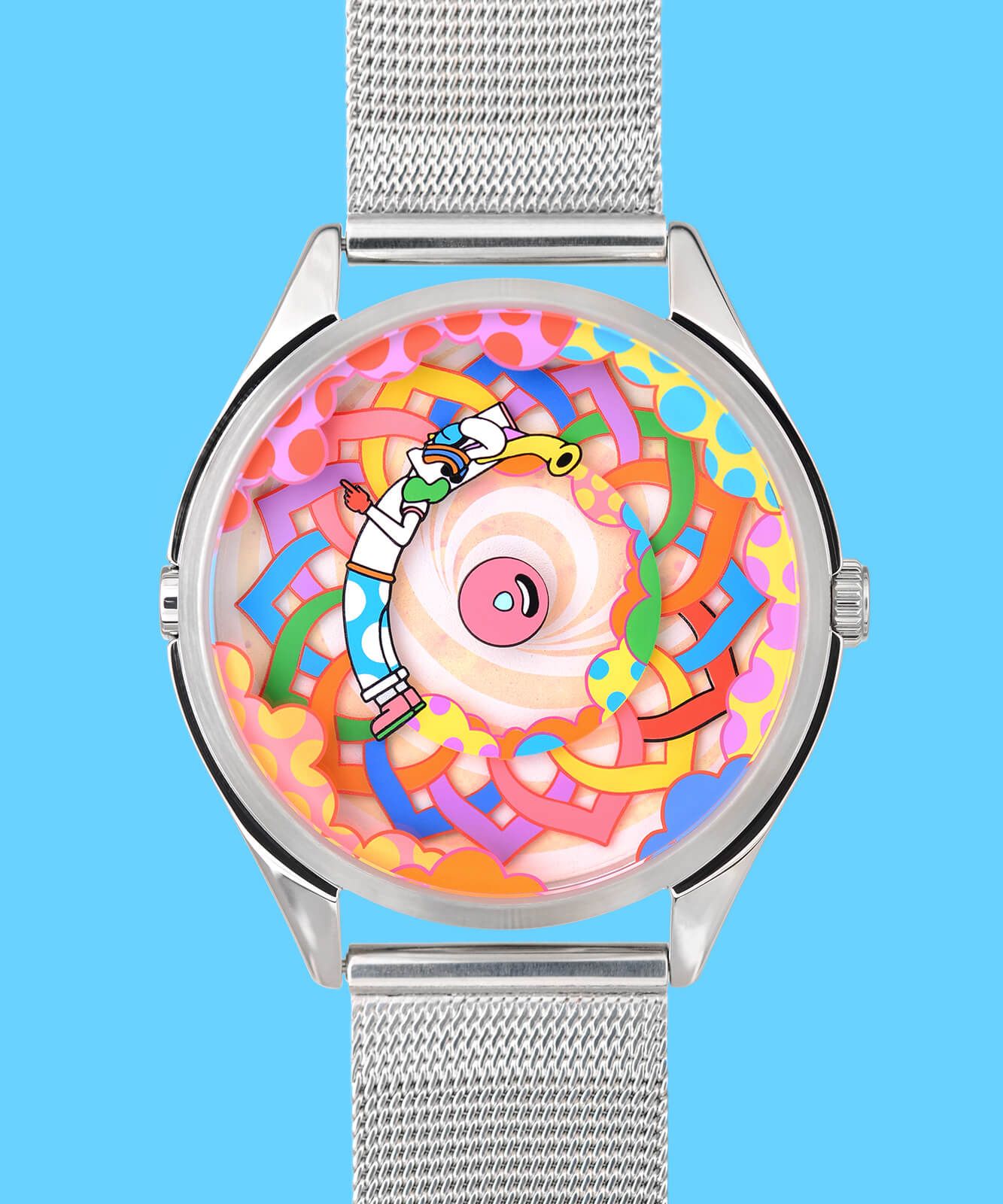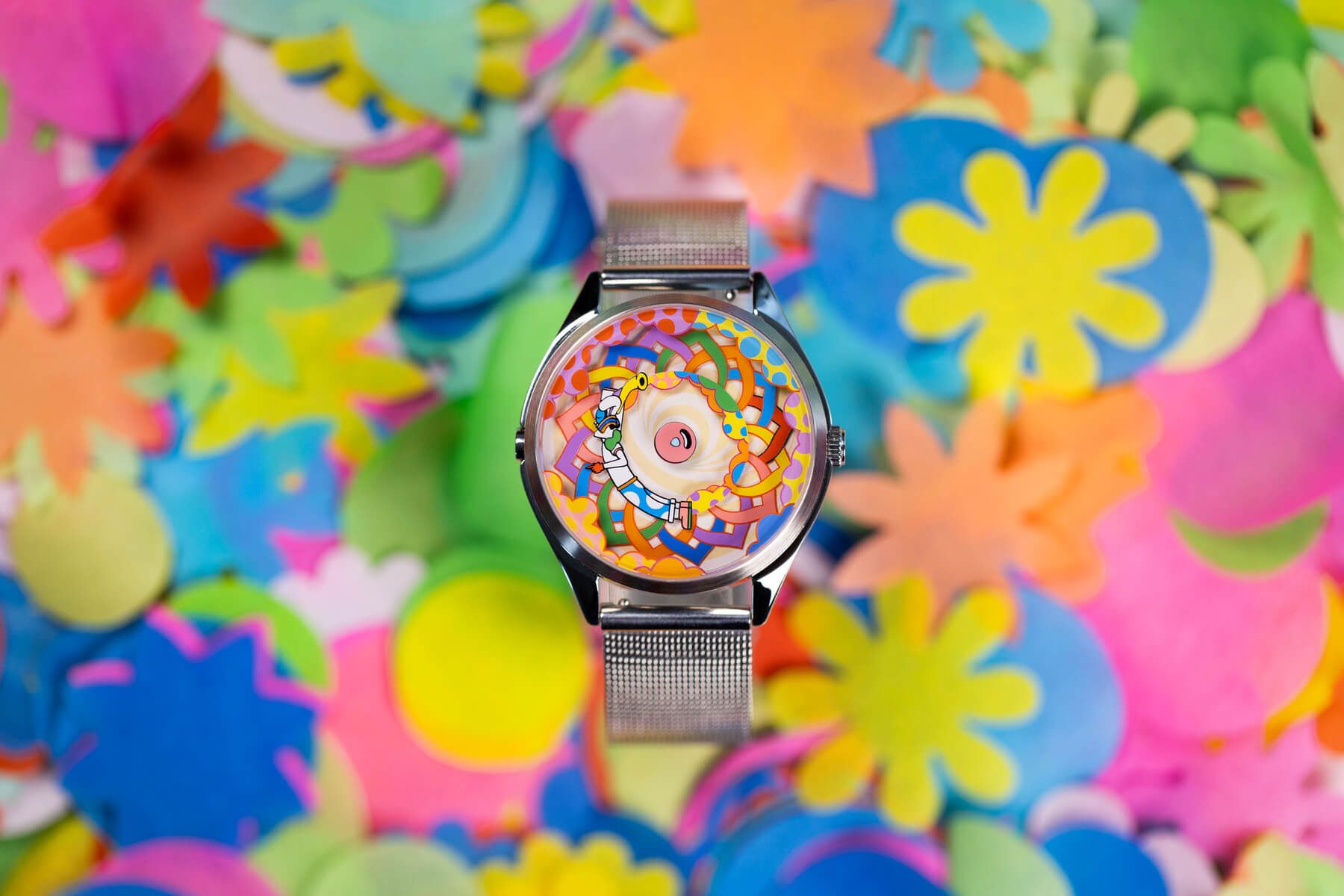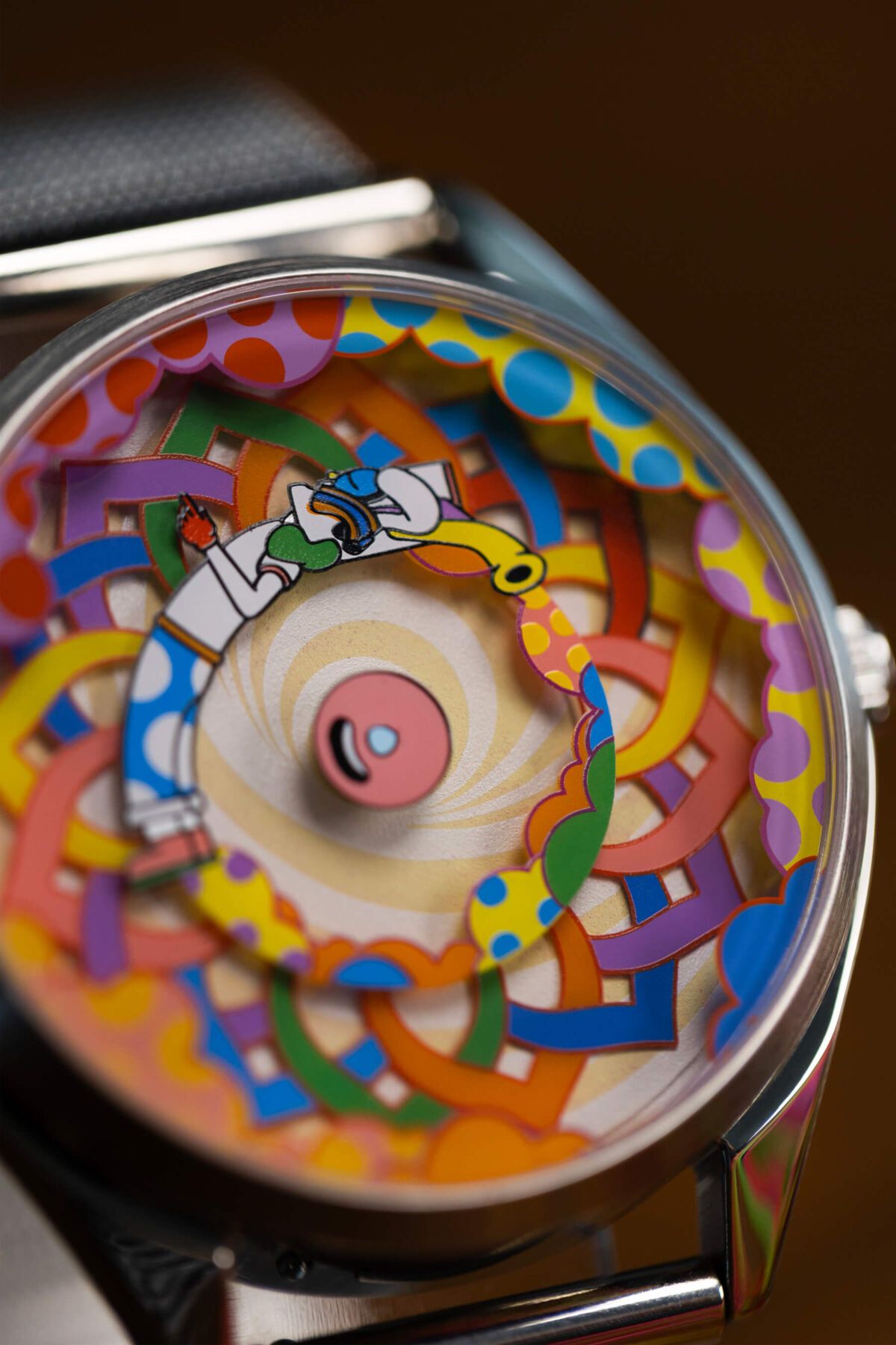 La esfera es un pequeño espectáculo en constante movimiento: un patrón simétrico entrelazado forma un círculo lleno de colores en el centro, acompañado por Muru, el icónico personaje de Murugiah, el diseñador del reloj. A su alrededor, unas nubes coloridas se suman a la escena, creando un conjunto alegre y dinámico que no deja de moverse, brutalmente divertido. ¿Y como leo la hora te preguntarás? Pues muy sencillo, el pétalo rojo indica las horas y Muru está señalando con el dedo los minutos, ¡creatividad al máximo!