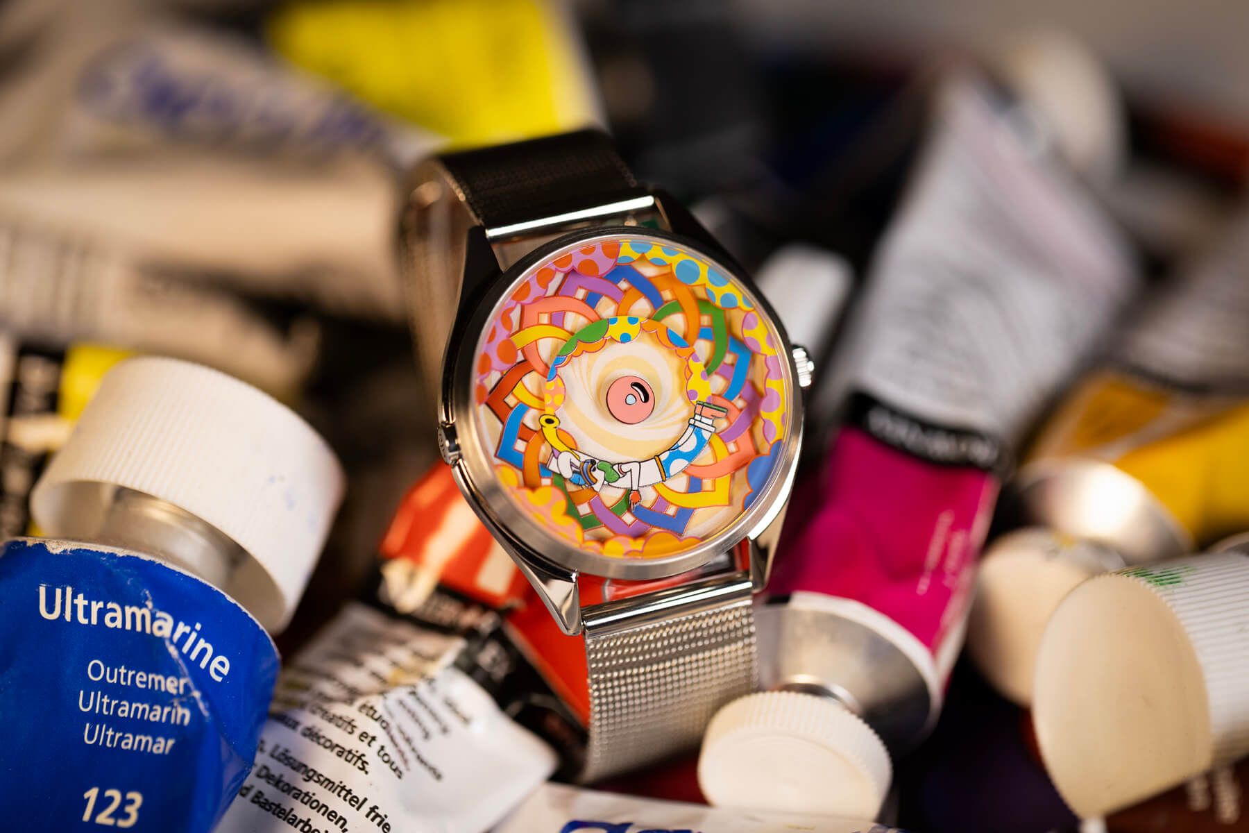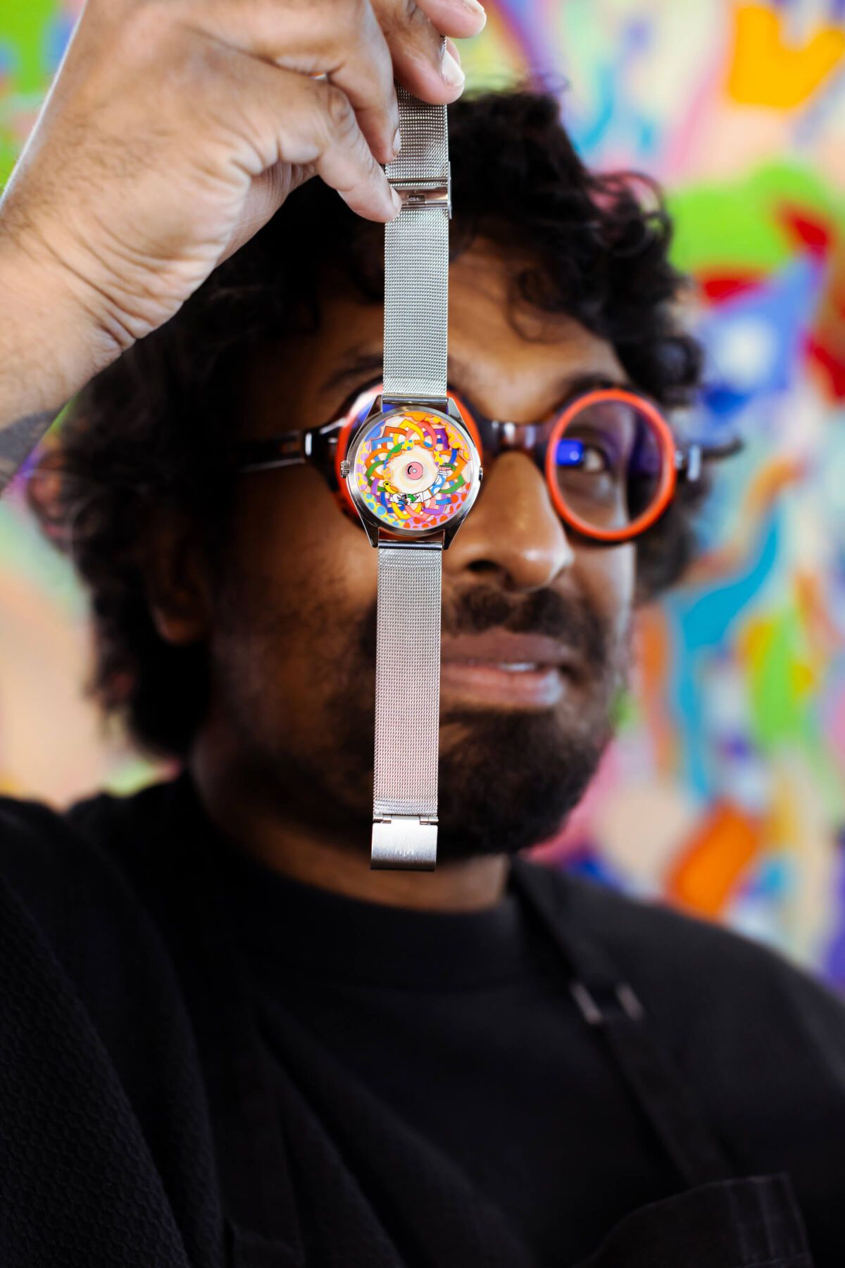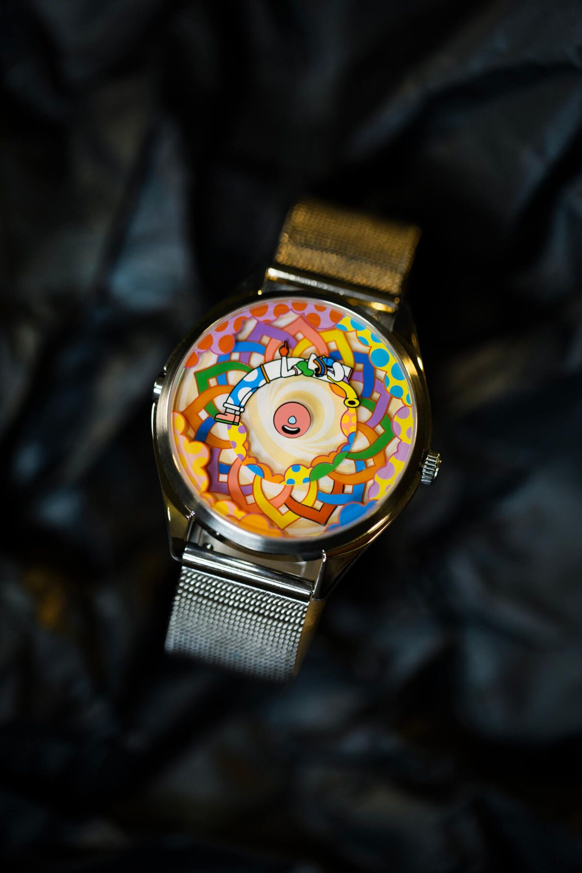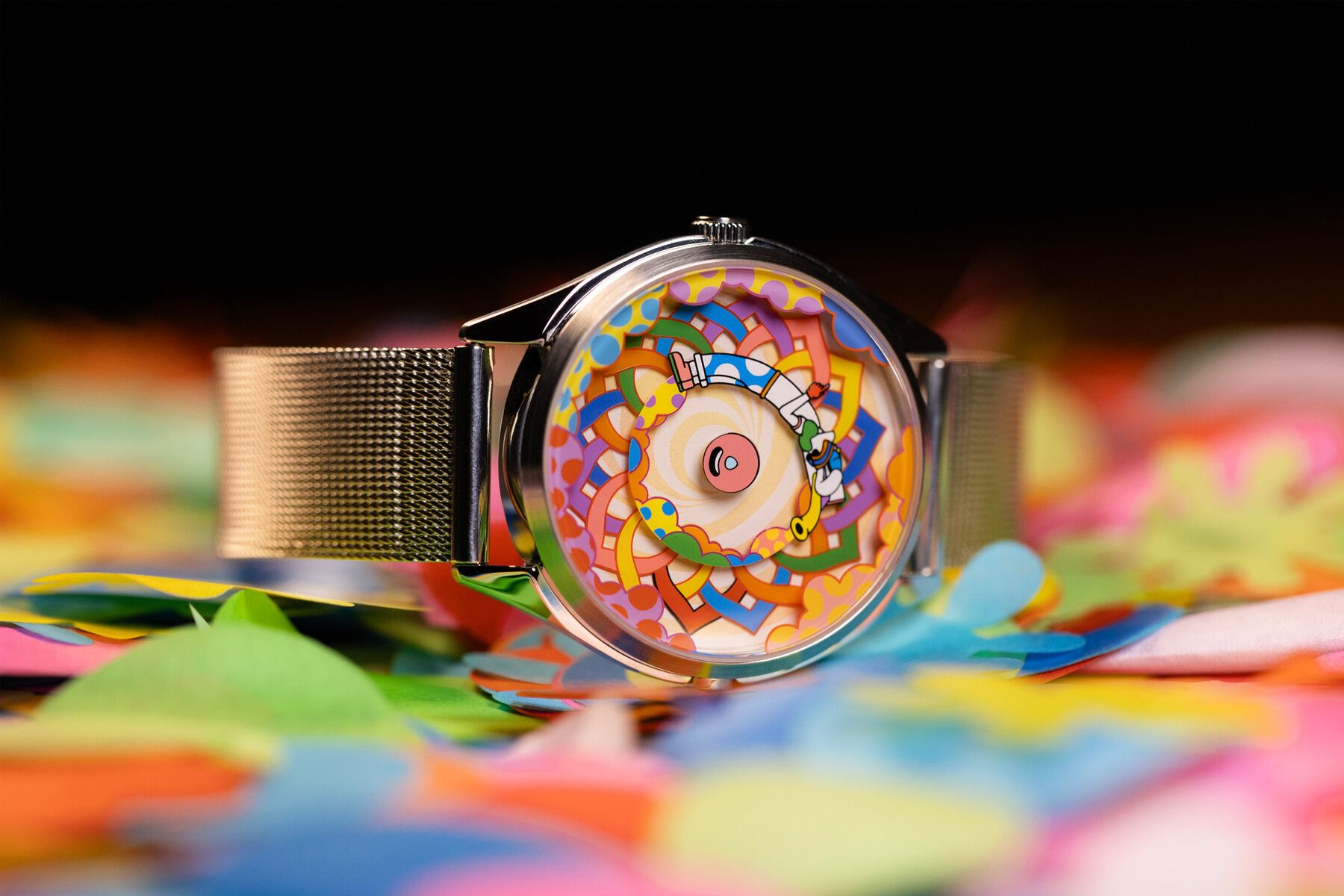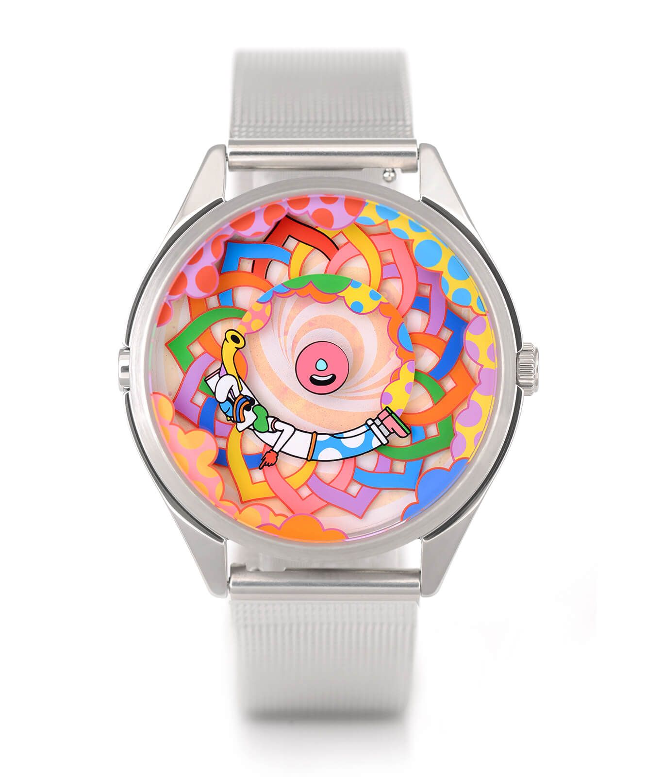 La esfera es un pequeño espectáculo en constante movimiento: un patrón simétrico entrelazado forma un círculo lleno de colores en el centro, acompañado por Muru, el icónico personaje de Murugiah, el diseñador del reloj. A su alrededor, unas nubes coloridas se suman a la escena, creando un conjunto alegre y dinámico que no deja de moverse, brutalmente divertido. ¿Y como leo la hora te preguntarás? Pues muy sencillo, el pétalo rojo indica las horas y Muru está señalando con el dedo los minutos, ¡creatividad al máximo!