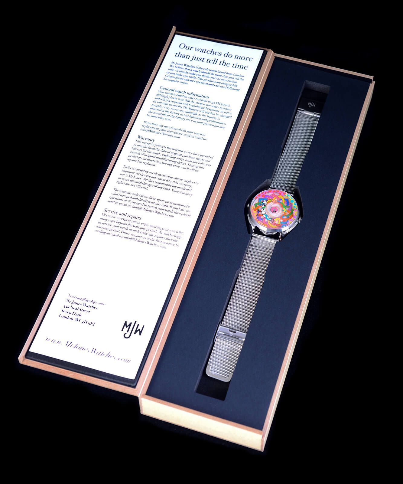 Es un reloj muy divertido en el que mirar la hora pasa casi a un segundo plano. Los colores de la esfera están muy bien elegidos, y el dedo apuntando a la hora me parece un detalle super creativo para sustituir a las manecillas y saber en qué hora nos encontramos. La elección de la malla milanesa por parte del equipo de Mr Jones me parece muy acertada, el reloj gana enteros con ella. Una opción fantástica para dar un toque de color y alegría a tu colección.
