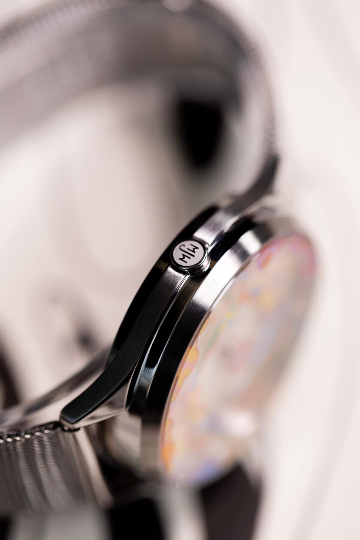 La caja del Daydreamer alberga un mecanismo de cuarzo y tiene un diámetro de 37 mm. Está fabricada en acero inoxidable con acabado pulido en todas sus superficies, cristal de zafiro y presenta un detalle muy peculiar: una corona situada a las 9 que aporta simetría estética al conjunto de la caja, aunque en realidad no tiene ninguna función adicional en el reloj. Esta corona lleva grabado el logotipo de la marca y es ligeramente más pequeña que la situada a las 3, que es desde la que se ajusta y maneja el reloj. El reloj viene acompañado de una malla milanesa que le sienta genial y le aporta un toque elegante al conjunto.