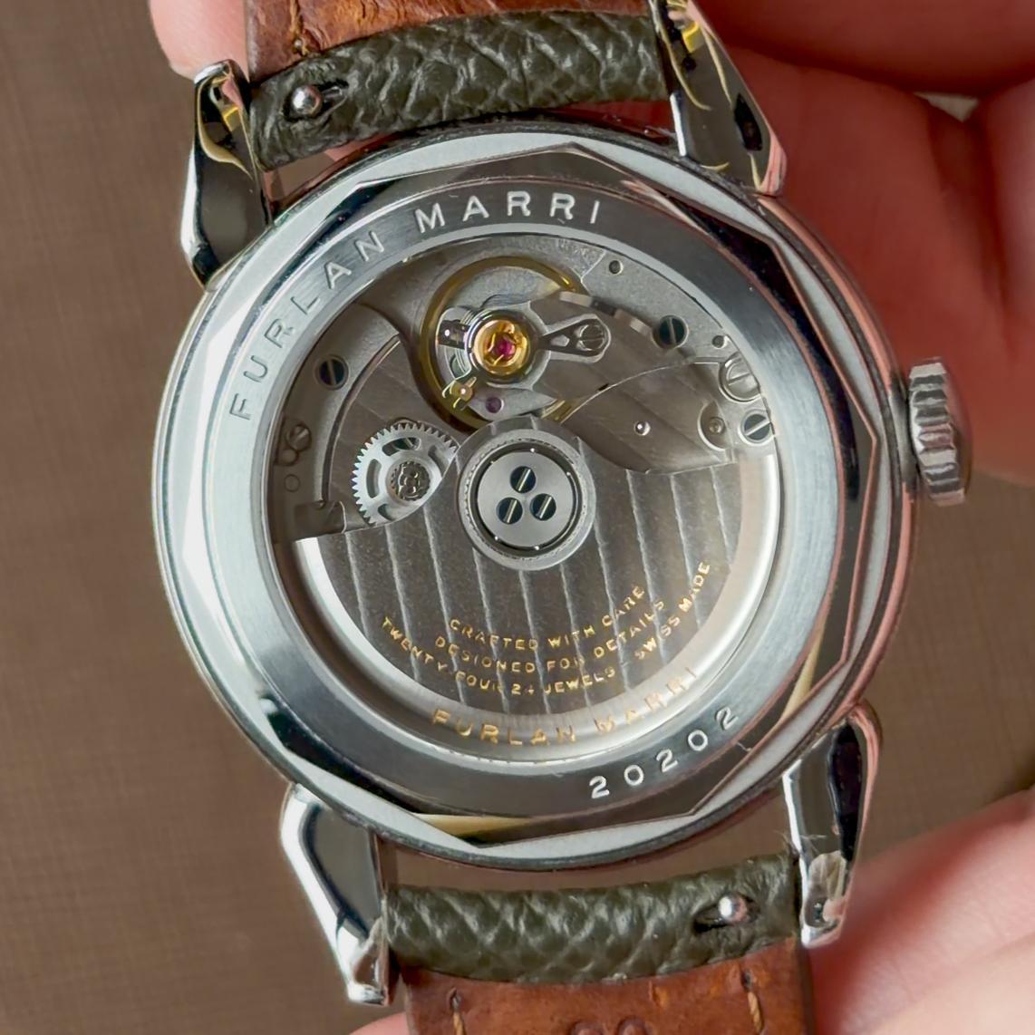 Dar la vuelta al reloj es una grata sorpresa. En lugar de optar por un calibre genérico y barato, Furlan Marri ha apostado por un movimiento de La Joux-Perret, con terminación propia de la marca y visible a través del fondo.