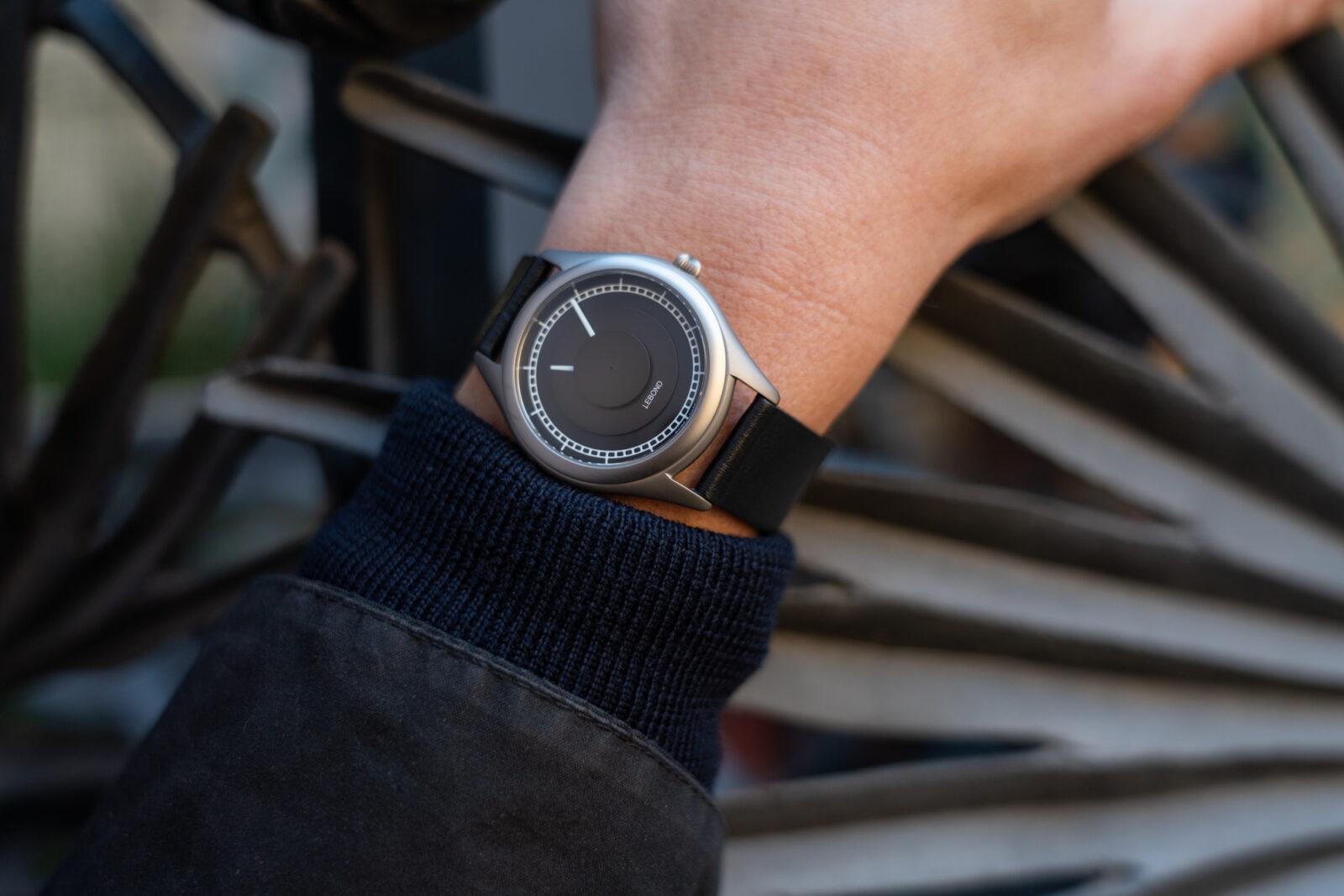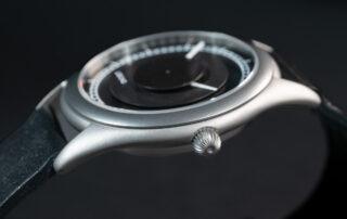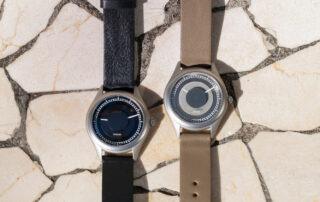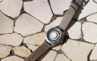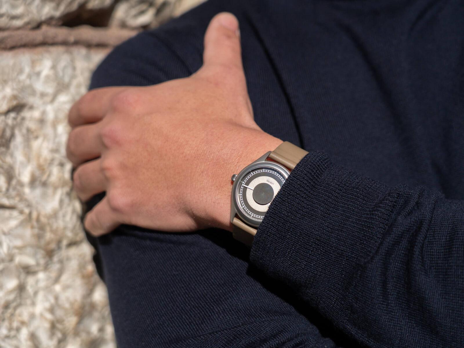 Otro detalle interesante es la ubicación del logotipo. En lugar de situarse directamente sobre la esfera, Lebond lo coloca bajo el cristal, lo que permite mantenerlo en una posición más centrada sin interferir con los discos. El Attraction se presenta en dos versiones: una con esfera y discos en un tono metálico, y una segunda que mantiene los mismos acabados pero apuesta por una paleta más oscura, con discos en gris antracita y esfera negra, con un carácter más sobrio. Las correas elegidas son de cuero Nappa con un ancho de 18 mm, en marrón claro y negro, respectivamente.
