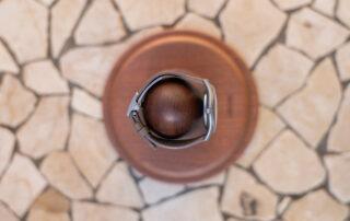 Con 42 cm de altura y un peso de 3 kg, este soporte reproduce las proporciones y geometrías del proyecto original.. Destacan especialmente las curvas catenarias, tan características del lenguaje de Gaudí. Está realizado en madera maciza de sapeli y requiere unas 20 horas de trabajo artesanal por parte de un tornero en Barcelona.