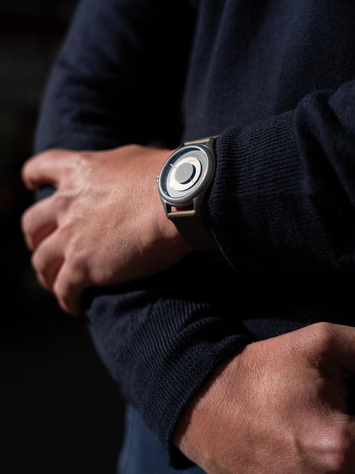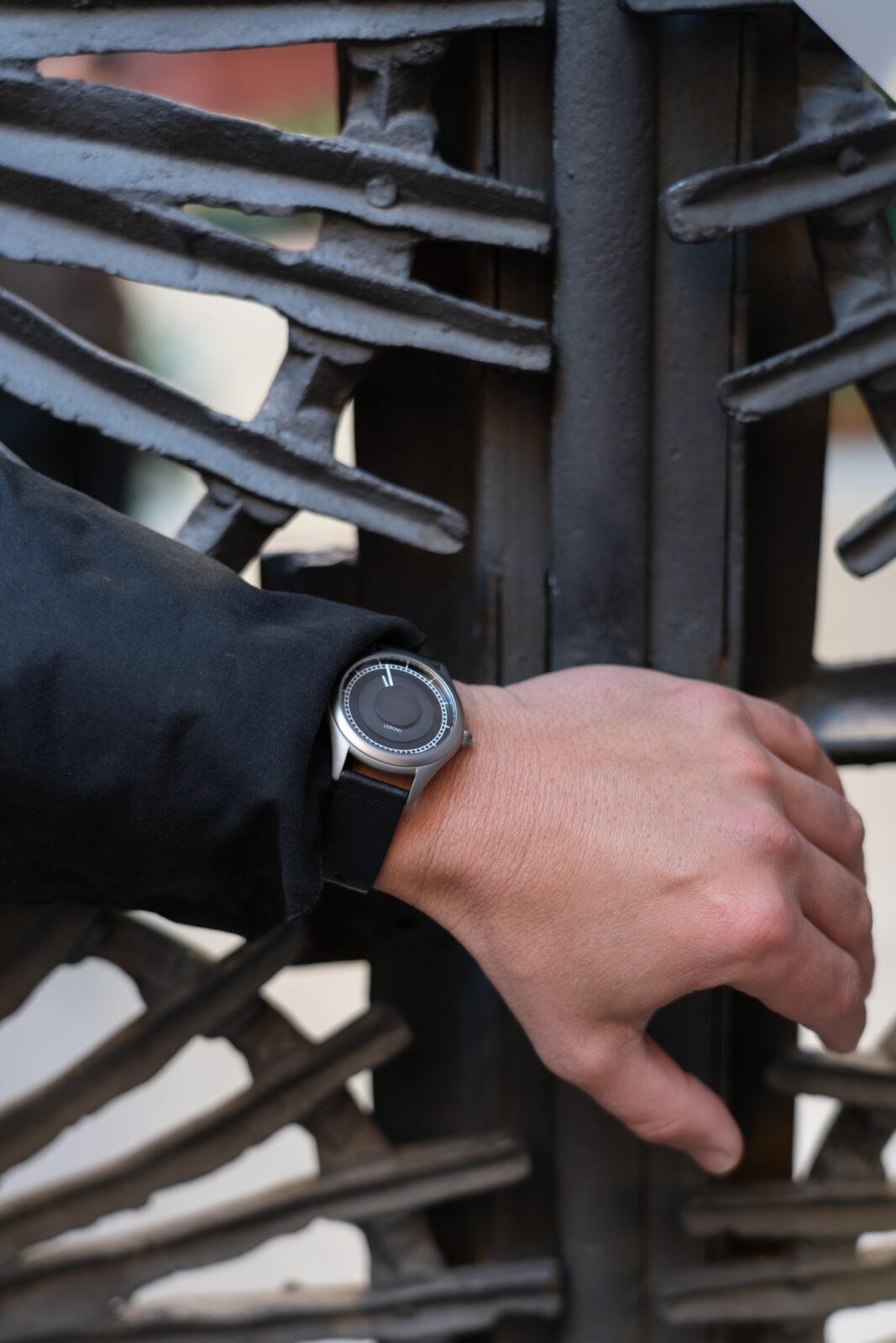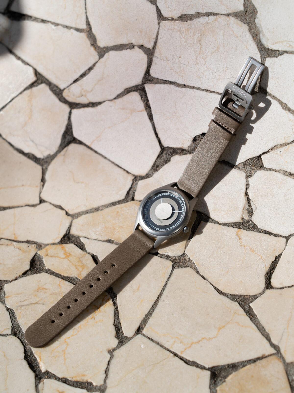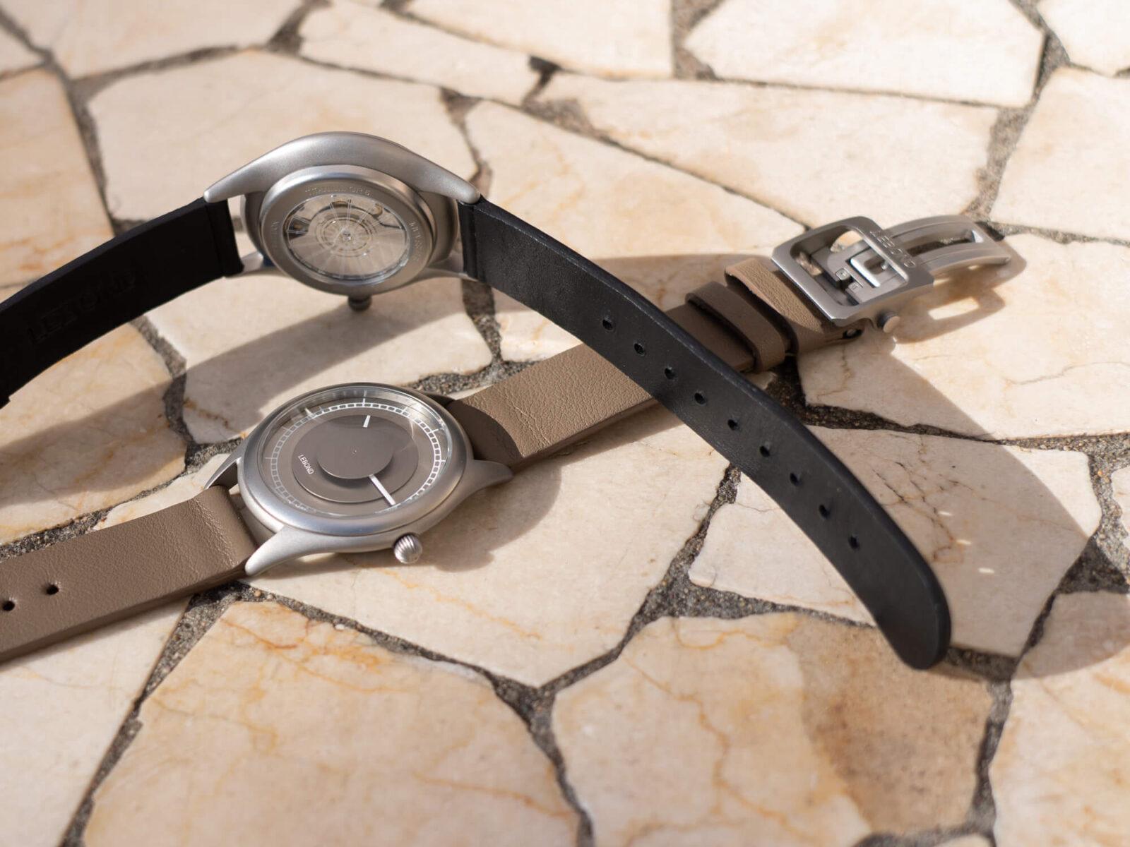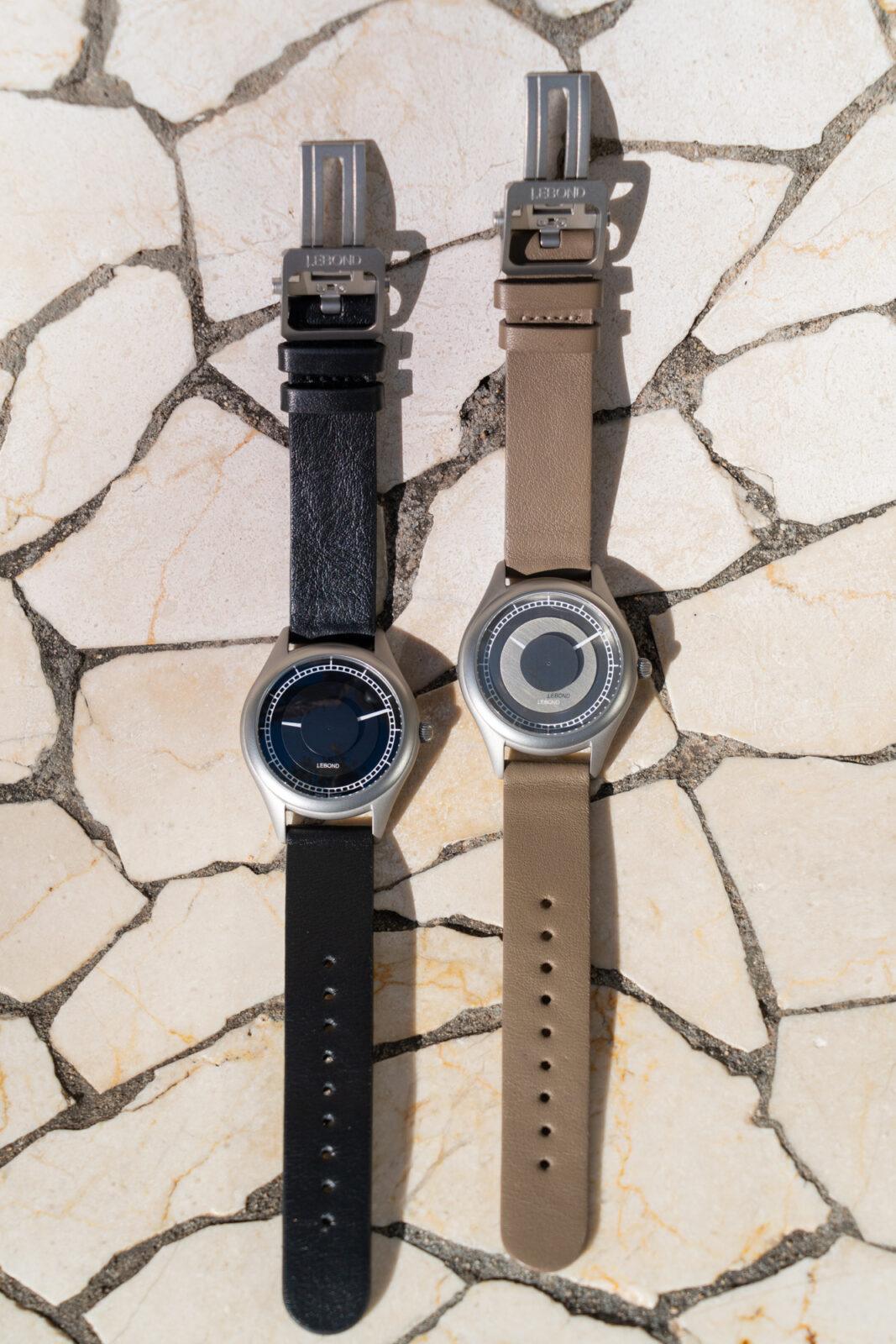 Otro detalle interesante es la ubicación del logotipo. En lugar de situarse directamente sobre la esfera, Lebond lo coloca bajo el cristal, lo que permite mantenerlo en una posición más centrada sin interferir con los discos. El Attraction se presenta en dos versiones: una con esfera y discos en un tono metálico, y una segunda que mantiene los mismos acabados pero apuesta por una paleta más oscura, con discos en gris antracita y esfera negra, con un carácter más sobrio. Las correas elegidas son de cuero Nappa con un ancho de 18 mm, en marrón claro y negro, respectivamente.
