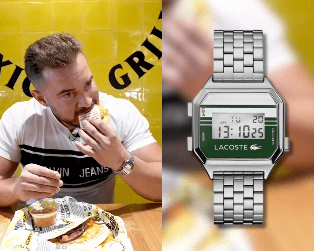 El siguiente reloj con el que vimos a Pablo tiene truco. Y es que, a primera vista parecería un Casio F91-W, pero mirándolo más de cerca, podemos ver que se trata de otro reloj Lacoste.