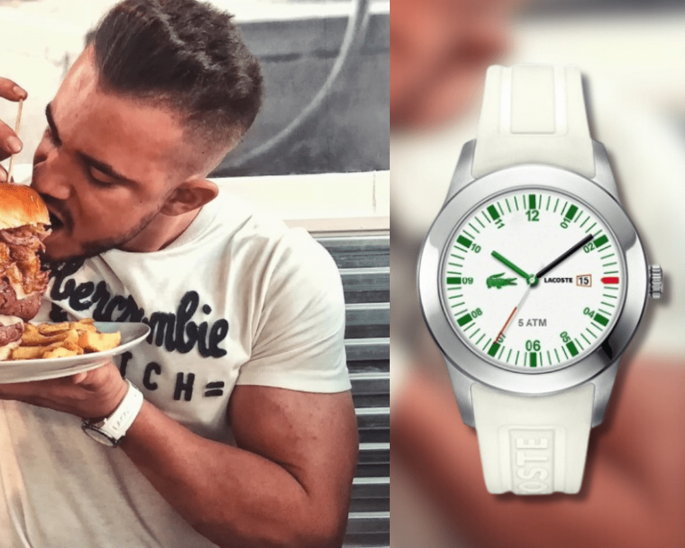 Dos de las primeras piezas de su colección pertenecen a esta categoría: por un lado un reloj Lacoste, con correa de caucho blanca que probablemente sea un Lacoste Advantage, valorado en 129 EUR. Un reloj deportivo de cuarzo y con una resistencia al agua de 50m.