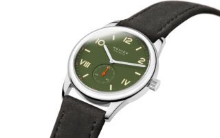 El Nomos Club Campus All Olive, por su parte, ofrece una interpretación más sobria, pero no menos interesante. El verde oliva profundo se combina con índices perfilados en amarillo y una minutería en rosa, aportando ese punto de contraste.
