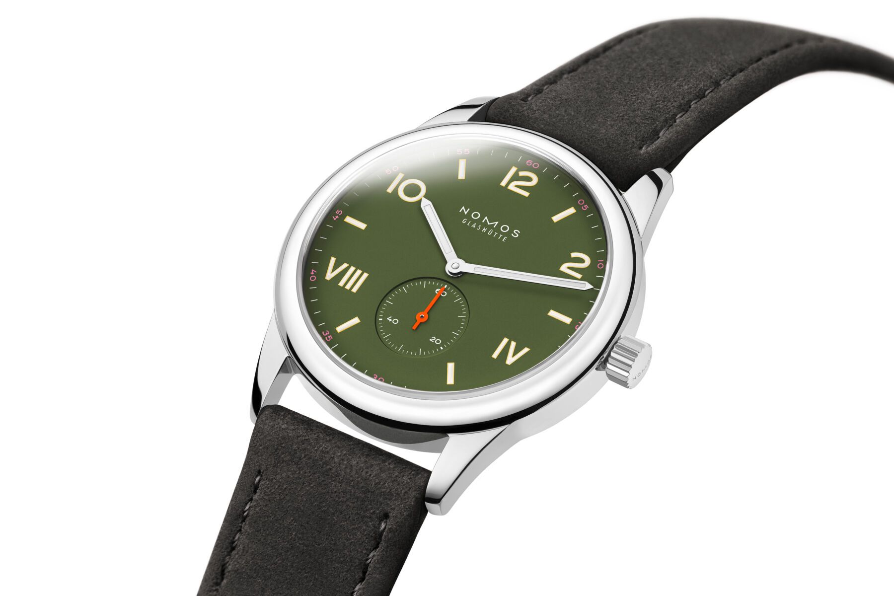 El Nomos Club Campus All Olive, por su parte, ofrece una interpretación más sobria, pero no menos interesante. El verde oliva profundo se combina con índices perfilados en amarillo y una minutería en rosa, aportando ese punto de contraste.
