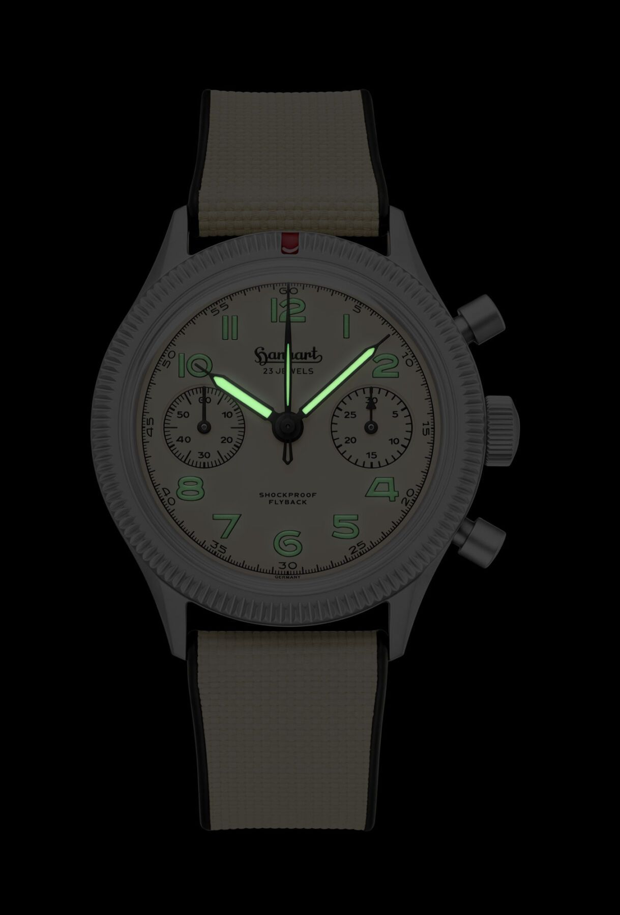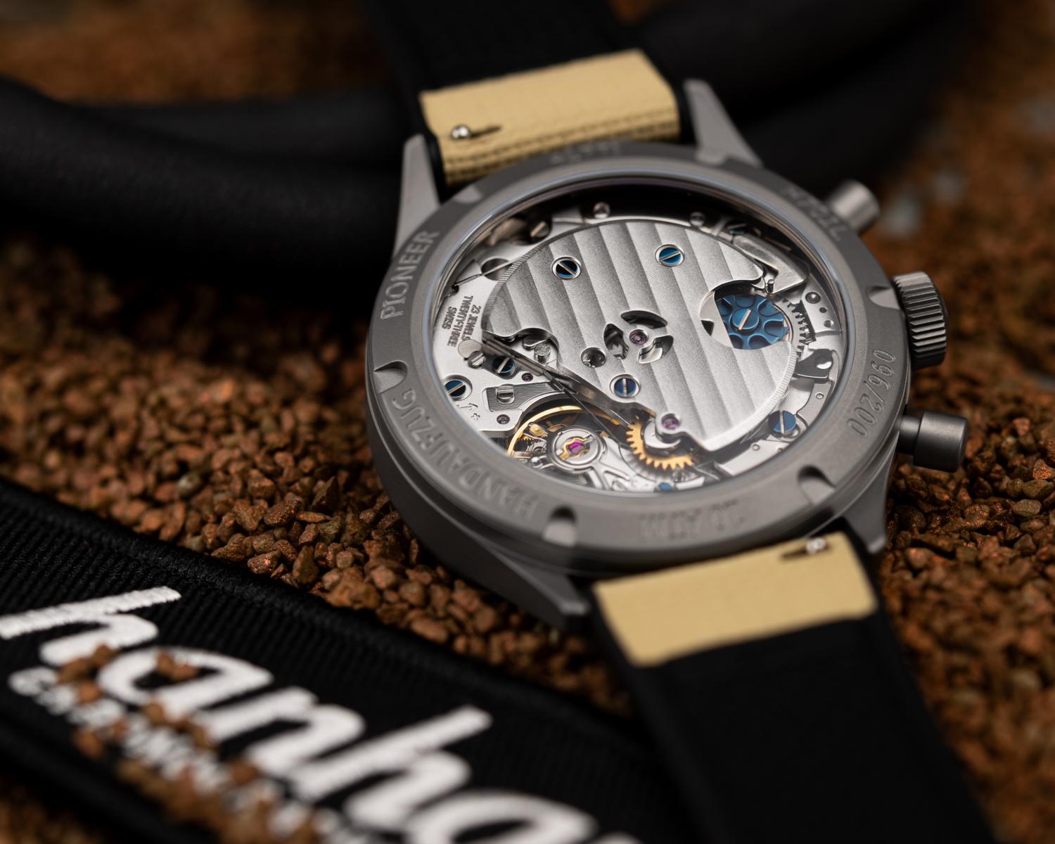 Es un movimiento de carga manual, con rueda de pilares y, lo más importante, función Flyback (lo que en la época de la aviación alemana llamaban Temposchaltung). Esto significa que, pulsando el botón inferior mientras el crono está en marcha, la aguja vuelve a cero y reinicia la medición de forma instantánea. Todo ello acompañado de 58 horas de reserva de marcha y ajustado en seis posiciones por los relojeros de Hanhart en Gütenbach, garantizando una precisión envidiable de 0 a +8 segundos al día. Esto se hace para equiparar al -4/+4 segundos diarios, pero evitando que retrase en cualquiera de los casos, ya que es mejor llegar pronto que tarde, esa es la filosofía de ajustarlo en valores positivos.