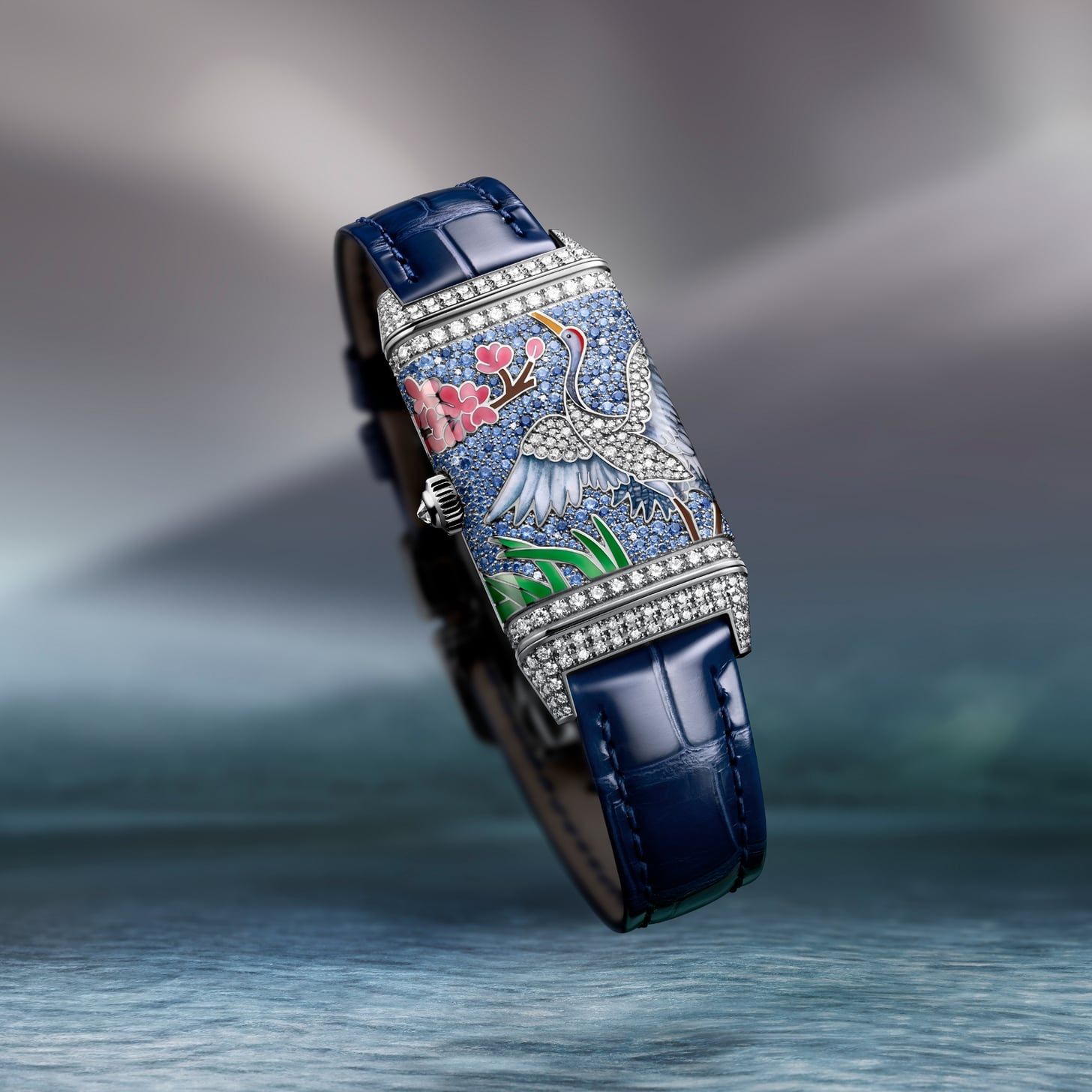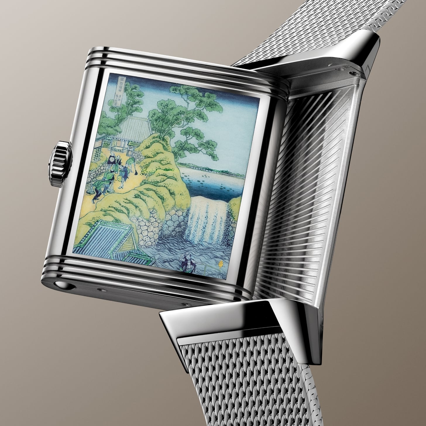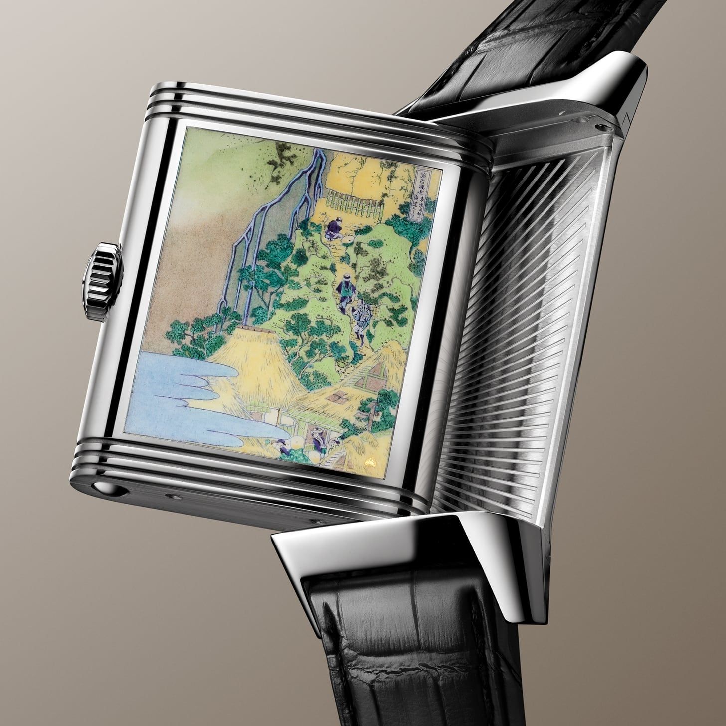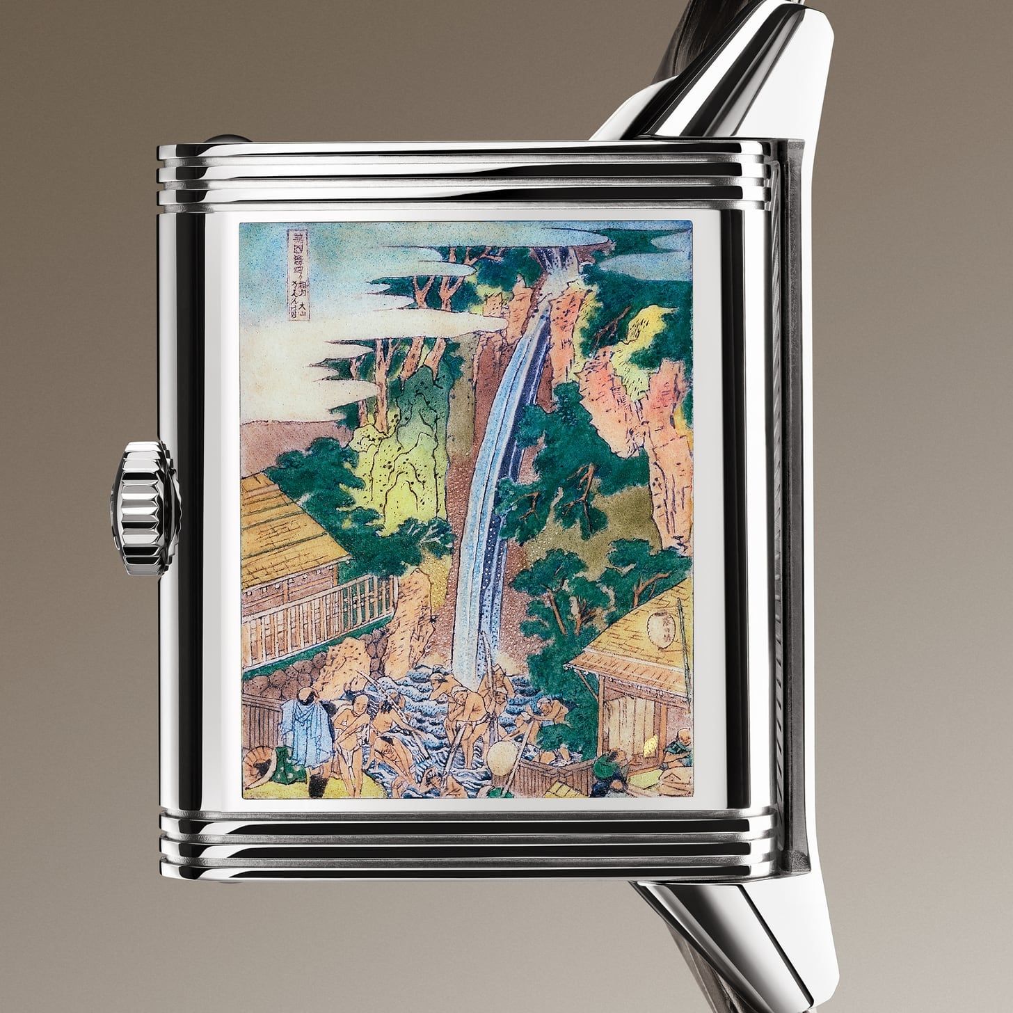 Jaeger-LeCoultre cierra en 2026 su homenaje a la serie de ocho grabados de cascadas del maestro del período Edo Katsushika Hokusai, iniciada en 2021. Este año llegan los cuatro últimos motivos, cada uno en edición limitada de 10 piezas: Rōben Waterfall at Ōyama in Sagami Province; Kiyotaki Kannon Waterfall at Sakanoshita on the Tōkaidō; Yōrō Waterfall in Mino Province; y The Falls at Aoigaoka in the Eastern Capital. Cada Reverso combina dos caras con un acabado artesanal exquisito. La cara frontal, que da la hora, implementa cuatro patrones distintos de guillochée, cada uno emparejado con un color de esmalte grand feu coordinado con la pintura del reverso. La cara contraria muestra una miniatura en esmalte grand feu pintada a mano sobre el dial. El proceso requiere 80 horas de trabajo, con hasta 14 capas de esmalte vitrificadas individualmente a 800 ºC y enfriadas entre capas. El «lienzo» mide apenas 2 cm², y aun así los artesanos del taller de Métiers Rares reproducen incluso los títulos en japonés de Hokusai con total legibilidad.