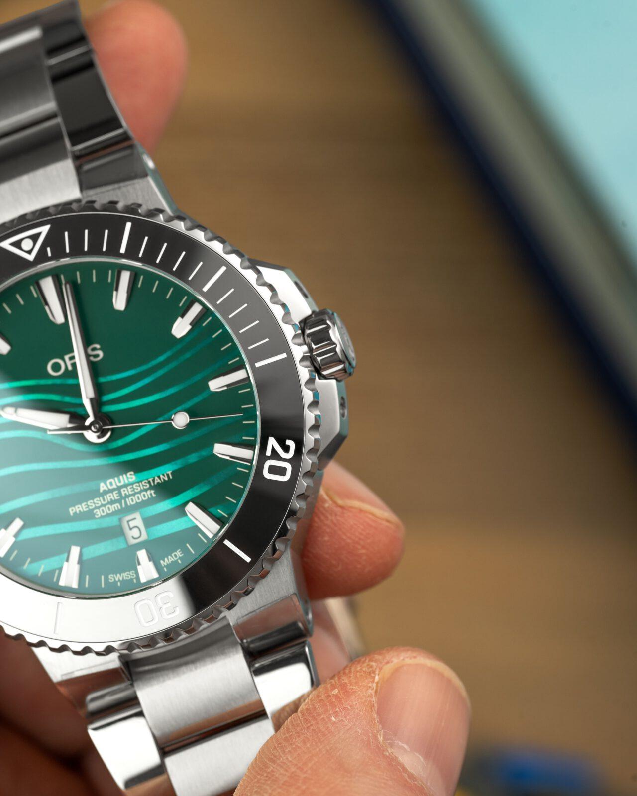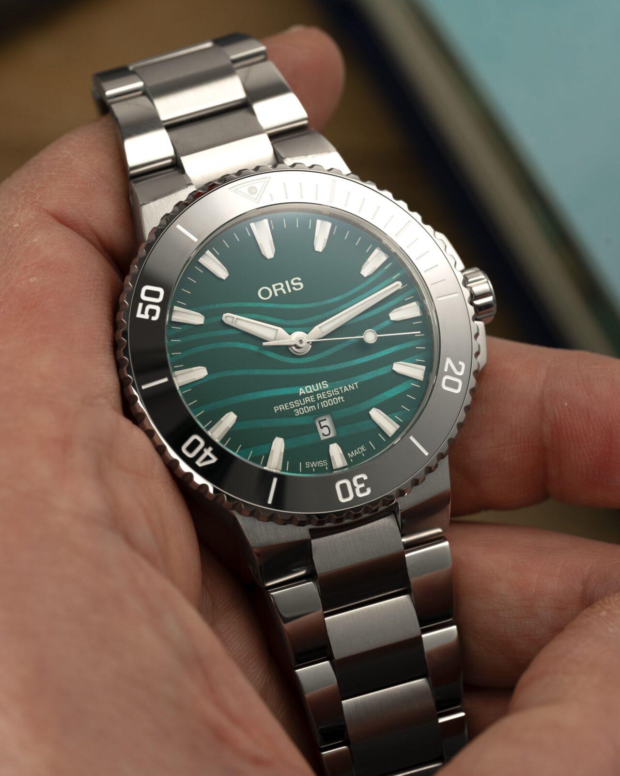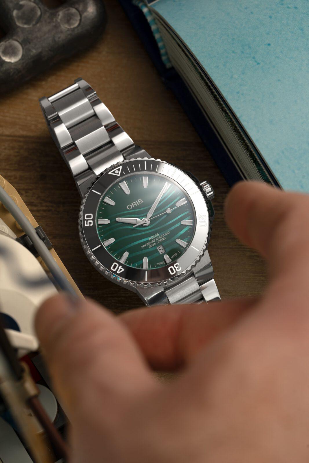 El primero, sin ninguna duda, es la esfera nacarada de color azul verdoso en acabado mate, inspirada en el río Yangtsé, y donde además Oris mediante un complicado proceso de impresión añaden unas ondulaciones en un verde más claro inspiradas en las ondas sonoras de eco de los clics ultrasónicos de banda estrecha y alta frecuencia de la marsopa sin aleta dorsal del Yangtsé, ondas que utiliza para comunicarse y moverse por las turbulentas aguas de este río.