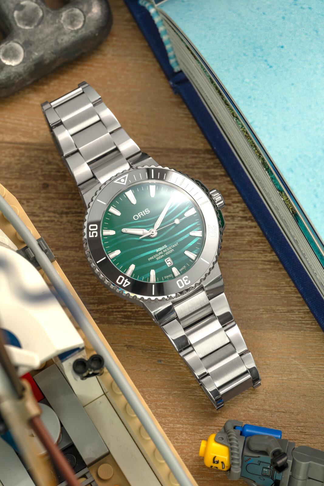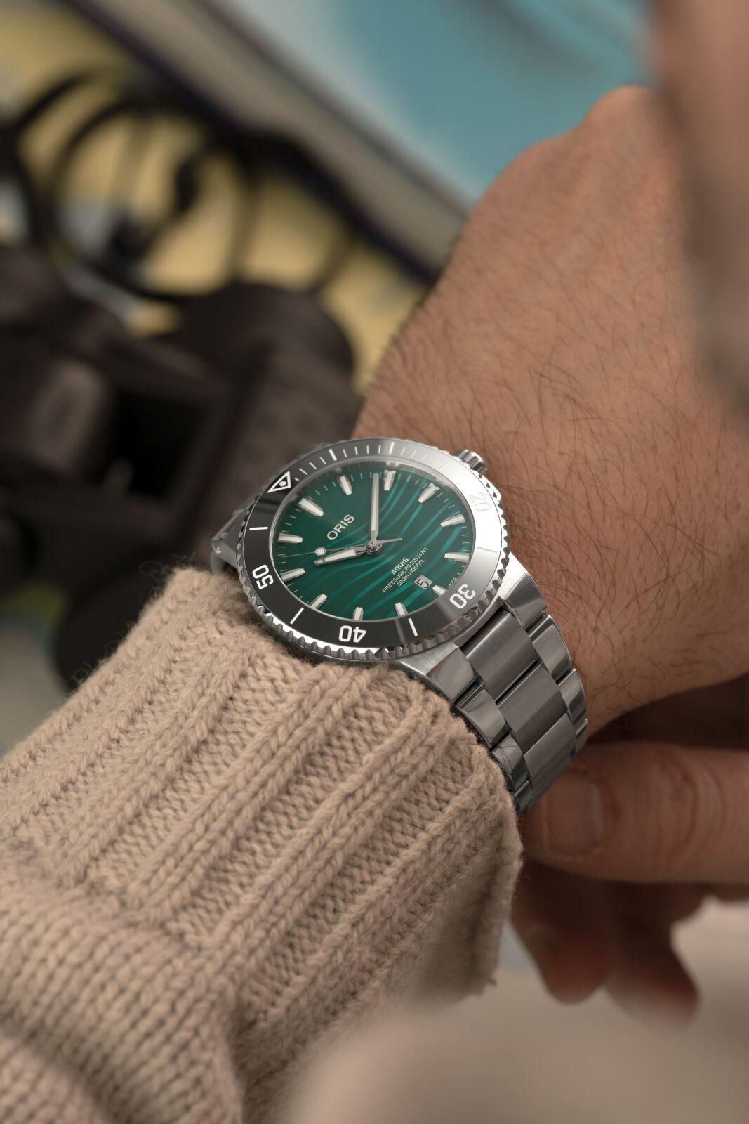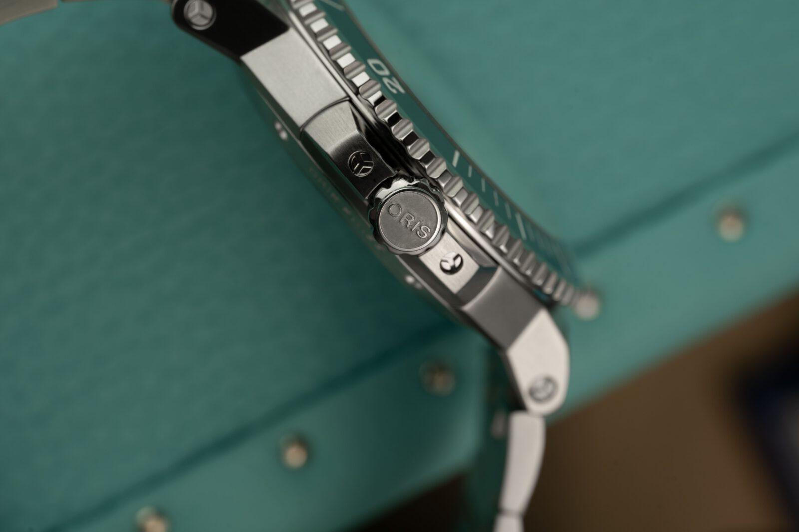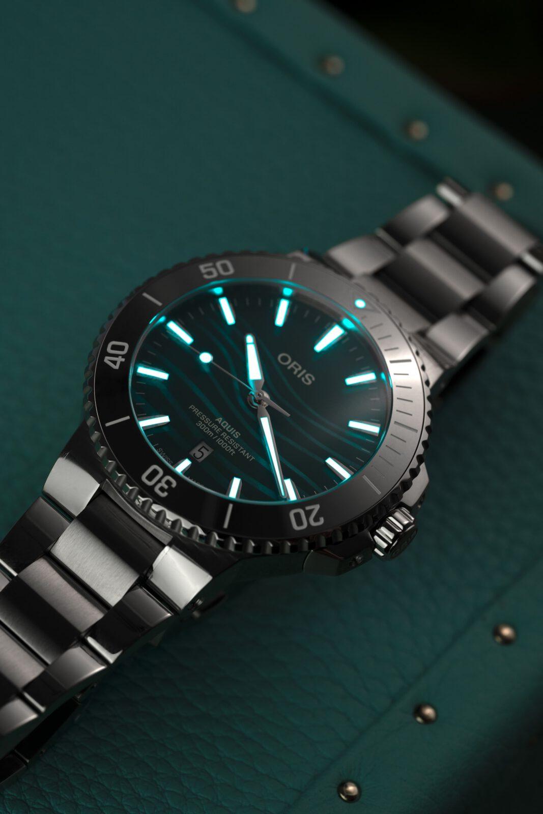 El primero, sin ninguna duda, es la esfera nacarada de color azul verdoso en acabado mate, inspirada en el río Yangtsé, y donde además Oris mediante un complicado proceso de impresión añaden unas ondulaciones en un verde más claro inspiradas en las ondas sonoras de eco de los clics ultrasónicos de banda estrecha y alta frecuencia de la marsopa sin aleta dorsal del Yangtsé, ondas que utiliza para comunicarse y moverse por las turbulentas aguas de este río.