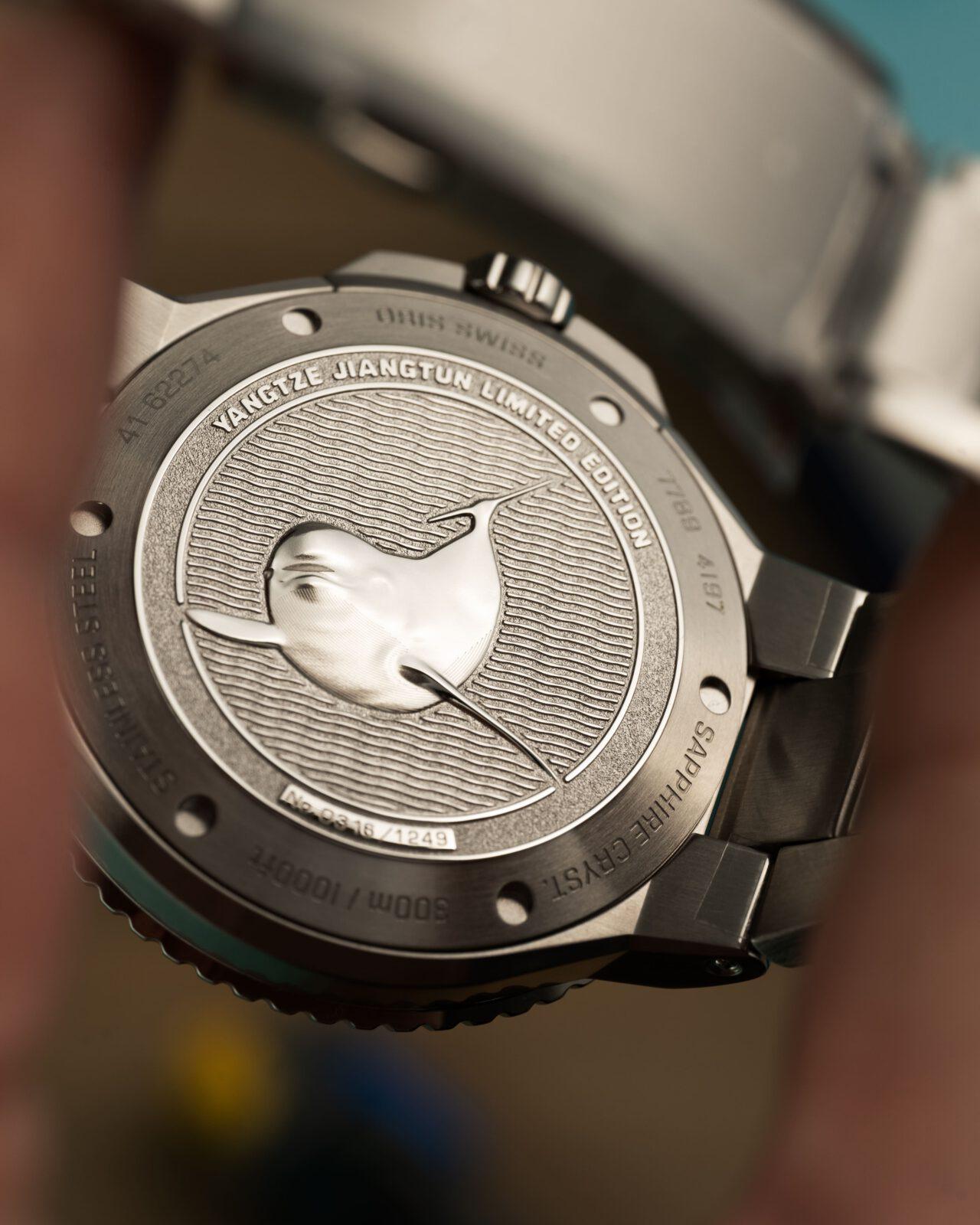 En esta última ocasión, Oris ha colaborado con la Changjiang Conservation Foundation, CCF, una organización dedicada a la restauración y protección del río Yangtsé, y más concretamente a uno de sus habitantes: la marsopa sin aleta del Yangtsé, una especie en extremo riesgo de extinción, de la cual se ha contabilizado que solo quedan 1,249 individuos. Esta cifra tan simbólica es precisamente la que Oris ha utilizado como número de piezas para esta edición limitada.