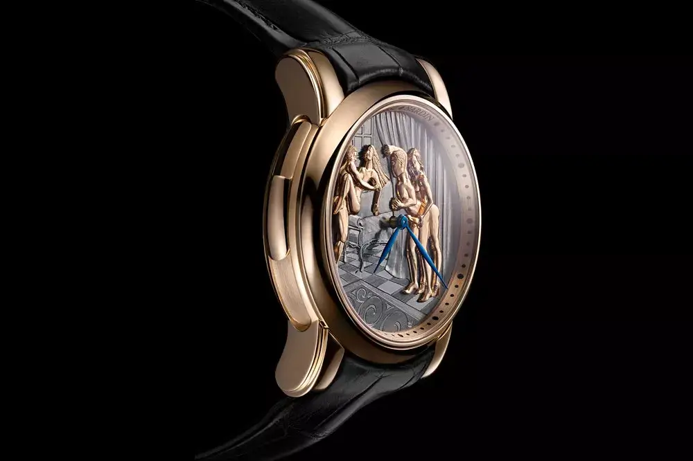 Sin embargo, no todas las casas apuestan por ese perfil bajo. Jacob & Co. concibe la relojería desde la extravagancia mediante un dogma: nunca hay suficientes diamantes. Modelos como el Calígula (ref. CL100.30.RD.AB.A) o el Rasputín (ref. CT200.30.BD.UC.A) exhiben escenas aún más llamativas que los propios diales. Representaciones explícitas del libertinaje asociado a ciertas figuras históricas.