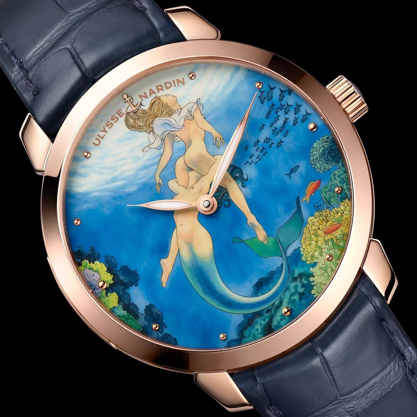 El artista Milo Manara ha colaborado con Ulysse Nardin en una serie que aborda la sexualidad desde múltiples enfoques, que van del fetichismo a lo explícito. El Classico Manara (ref. 3203-136LE-2/MANARA.06) reúne diversas escenas donde el erotismo se convierte en narrativa visual. En una de ellas, Ulysse y Nadia —una sirena y una mujer que reinterpretan alegóricamente el nombre de la marca— protagonizan una relación fantástica en las profundidades marinas.