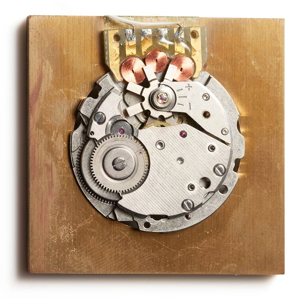 El cuarzo vibra a 32.768 Hz, como en cualquier reloj de este tipo, el IC compara constantemente la velocidad ideal con la velocidad real y aplica o libera un freno electromagnético según sea necesario, esto implica que: