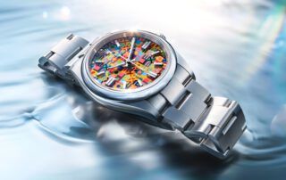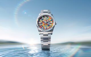 Rolex ha atraído de vuelta la esfera Jubilee, es decir, utilizasr las letras de ROLEX para hacer una composición colorida muy setentera. Lo hace con mucha maestría, ya que cada uno de los diez colores se aplican por separado.