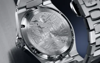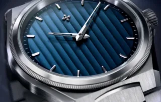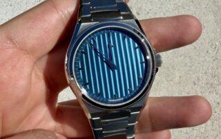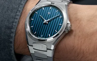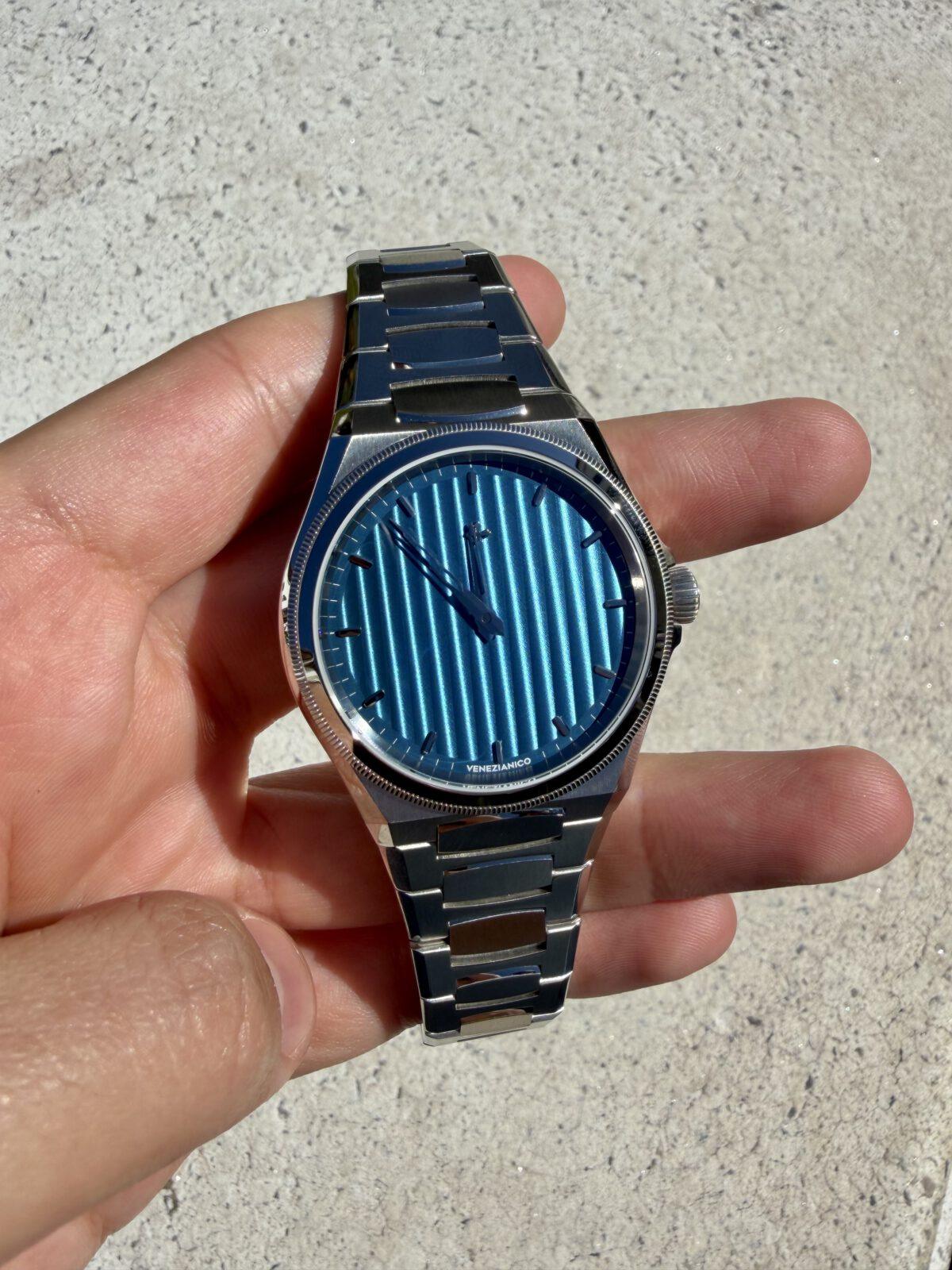 El dial, dividido en franjas verticales, muestra distintas tonalidades de azul según la luz. Este acabado —denominado «Côtes de Genève»— genera un efecto fluido que evoca el agua en movimiento. Personalmente recuerda al fenómeno del acqua alta, cuando la marea sube e inunda zonas bajas de la ciudad, como la Plaza de San Marcos. Una imagen icónica que nos transporta a la Venecia más evocadora.
